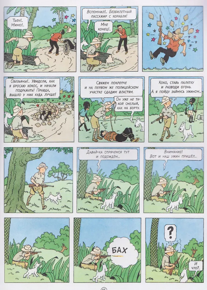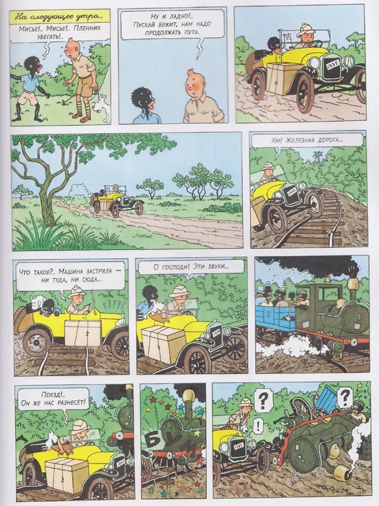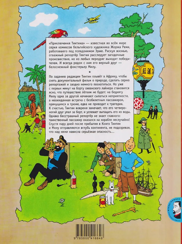 Тинтин в КонгоВ данный момент этот товар отсутствует в продаже. Возможно, у нас найдется аналогичный или похожий товар здесь. Серия: Приключения Тинтина По заданию издательства Тинтин плывёт в Африку, чтобы снять документальный фильм о природе саванны, сделать несколько репортажей об африканских племенах, ну и заодно немного поохотиться. Сразу после прибытия он отправляется вглубь континента в компании Милу и местного мальчугана Коко, согласившегося стать их проводником. В первый же день путешествия на горизонте появляется безбилетный пассажир с корабля, из-за которого Милу упал за борт и чуть не утонул. Незнакомец попытался угнать у них машину, но Тинтину удалось его схватить. При первой же возможности Тинтин намеревается сдать нарушителя властям, но наутро выясняется, что пленник сбежал, и наши друзья продолжают свой путь, не подозревая, что таинственный пассажир возник вновь неслучайно и что над ними нависла серьёзная опасность... |