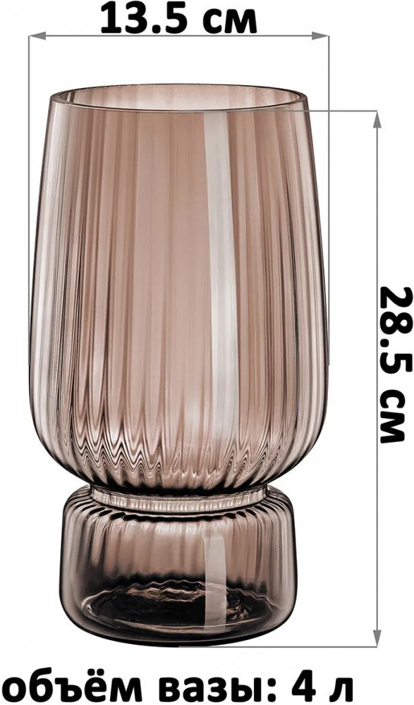 Ваза от Elan Gallery объёмом 4 литра выполнена из стекла. Имеет фигурную форму, ассоциирующуюся с большим изящным бокалом. Размер 13.5×13.5×28.5 см, диаметр дна вазы 13 см. Диаметр зауженной части 9.5 см. Поверхность прозрачной вазы имеет оттенок графит. Подойдёт для живых и искусственных цветов, веток и сухоцветов. Можно использовать как большой подсвечник: подходит для высокой свечи в форме столбика. Стильная вазочка послужит элементом декора для вашего дома.