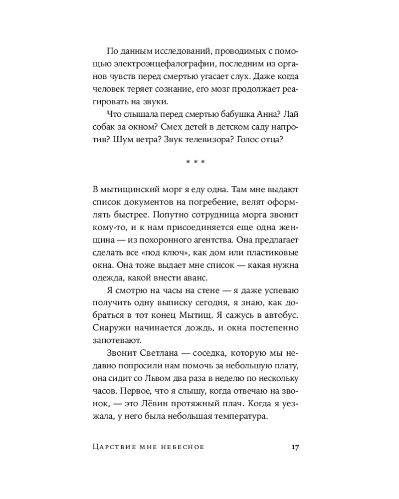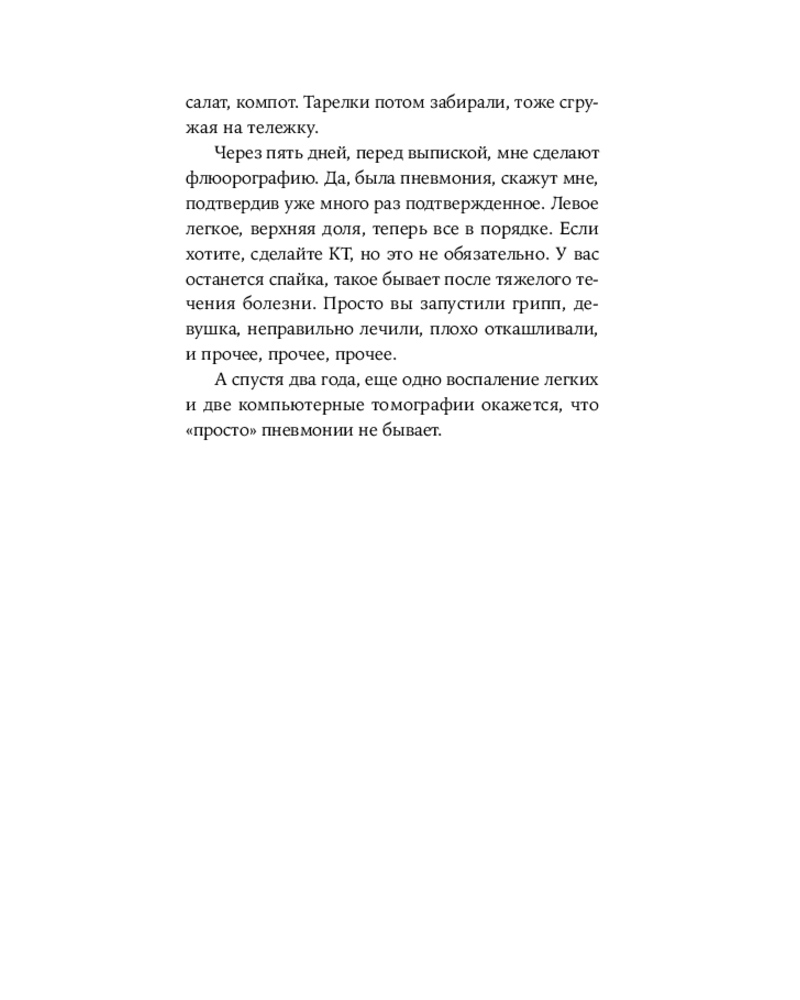 💳 Оплатить за товар можно при получении 🇰🇿 Есть бесплатная доставка по Казахстану от 1 дня 🎁 Копите бонусы с каждой покупки Молодая писательница Вера хоронит бабушек, которые заменяли ей родителей. Она часто задумывается о разводе, но не решается на перемены, пока ей не ставят диагноз «злокачественная опухоль легких». Вера не знает, каким будет исход операции и сможет ли увидеть, как растет ее маленький сын, но решает бороться до последнего. |