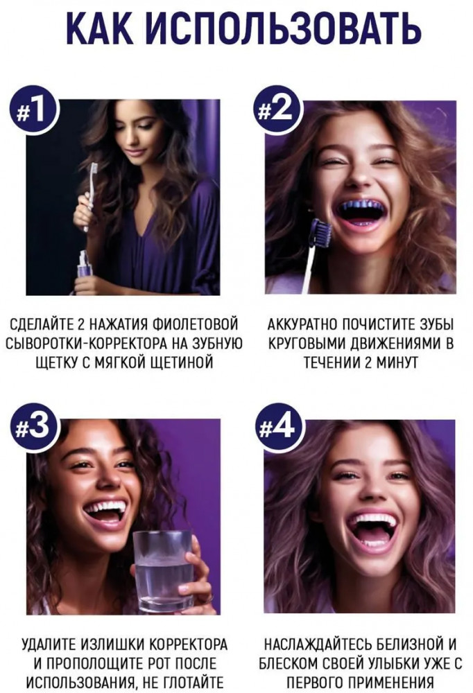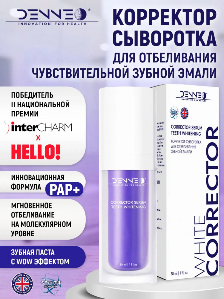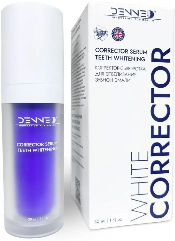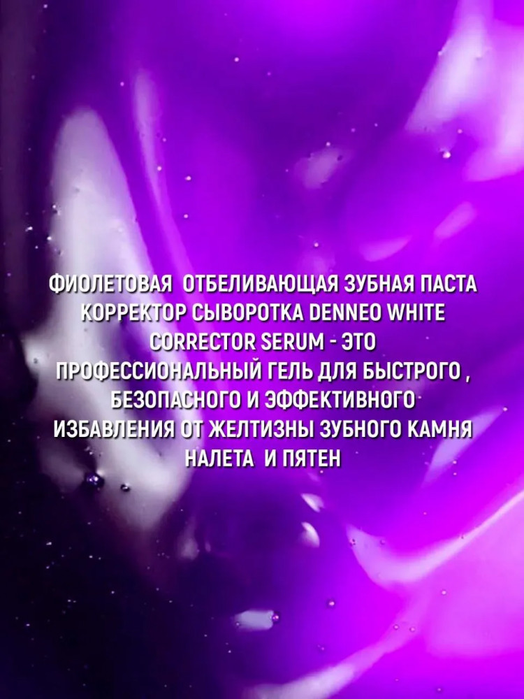Корректор-сыворотка для отбеливания чувствительной зубной эмали «Corrector serum teeth whitening» — это инновационная зубная паста, корректор-сыворотка для мгновенного безопасного отбеливания зубной эмали на молекулярном уровне. Зубная отбеливающая сыворотка Denneo «Corrector serum teeth whitening» — это профессиональный фиолетовый гель, который является настоящим прорывом в области отбеливания зубов и предназначен для быстрого, безопасного и эффективного избавления от желтизны, зубного камня, налета и пятен.