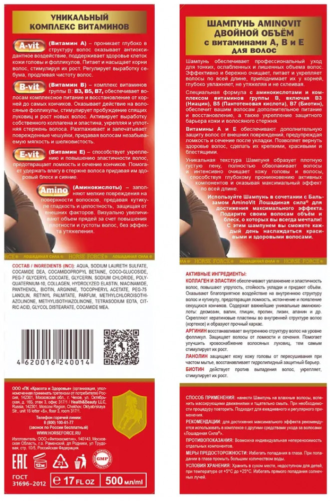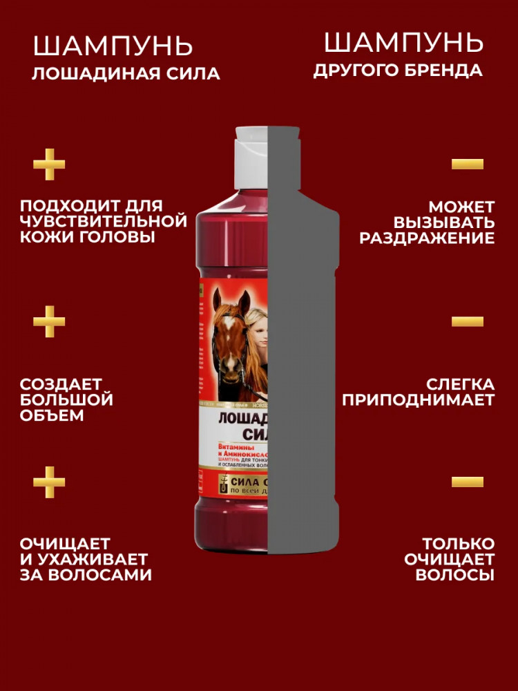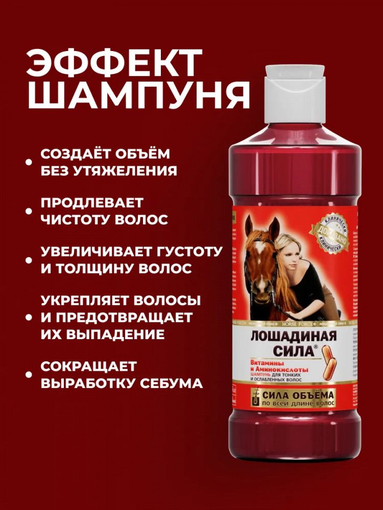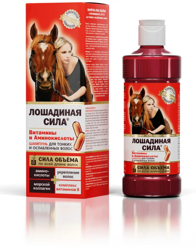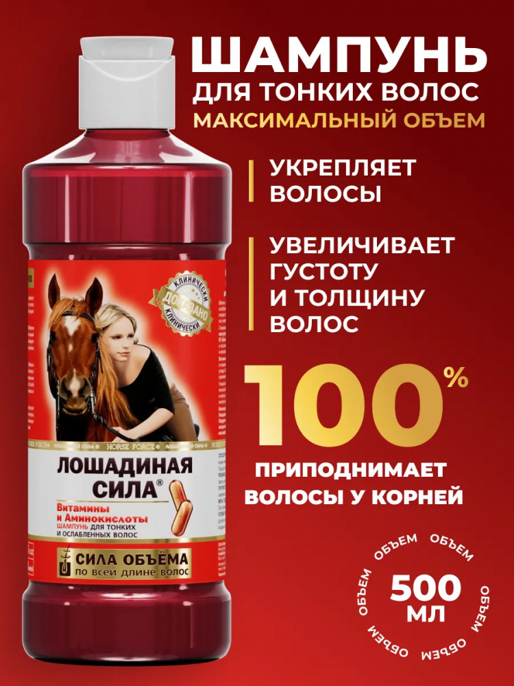 Шампунь для объема волос бренда Лошадиная сила обеспечивает профессиональный уход за тонкими, ослабленными и лишенными объема волосами. Эффективно очищает кожу головы и волосы, питая и укрепляя их по всей длине. Формула приподнимает пряди у корней, глубоко увлажняет без утяжеления и склеивания. Состав обогащен аминокислотами и комплексом витаминов группы В — В3 (ниацин), В5 (Пантотеновая кислота), В7 (биотин) — которые способствуют питанию, восстановлению и укреплению защитного барьера кожи головы и волосяного стержня. Витамины A и E обеспечивают дополнительную защиту от внешних повреждений, предупреждая ломкость и сечение после укладки. Такое средство позволяет вернуть здоровье поврежденным прядям, сделать их крепкими, красивыми и блестящими. Уникальная текстура образует густую плотную пену, которая полностью обволакивает волосы, интенсивно очищает пористые участки кожи головы и способствует глубокому проникновению активных компонентов для максимального эффекта по всей длине.