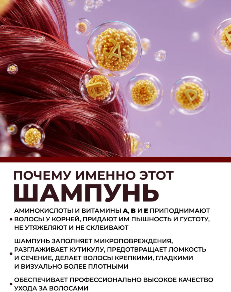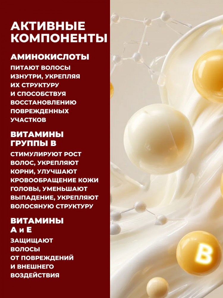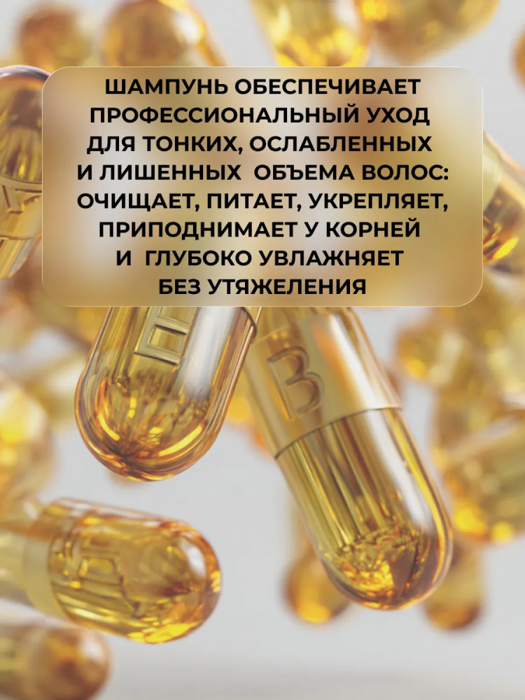Профессиональный уход, направленный на восстановление и питание тонких, ослабленных и лишенных объема волос. Средство эффективно очищает кожу головы и волосы, приподнимая пряди у корней и глубоко увлажняя их по всей длине без утяжеления или склеивания. Специальная формула обогащена аминокислотами и комплексом витаминов группы В — В3 (ниацин), В5 (пантотеновая кислота), В7 (биотин), которые питают волосяные фолликулы, стимулируют рост новых волос и укрепляют защитный барьер кожи головы. Он бережно питает ослабленные участки по всей длине прядей, восстанавливая структуру поврежденных волосяных стержней.