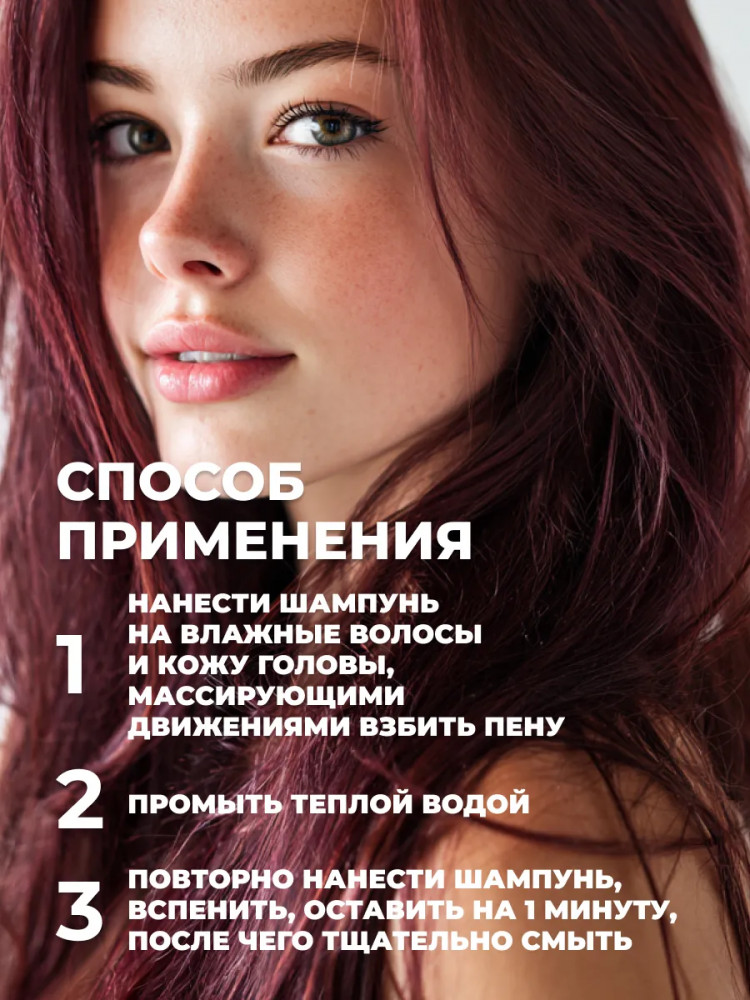 Способ применения: нанести шампунь на влажные волосы, вспенить массирующими движениями и тщательно смыть. При необходимости процедуру повторить. Подходит для ежедневного и регулярного применения.