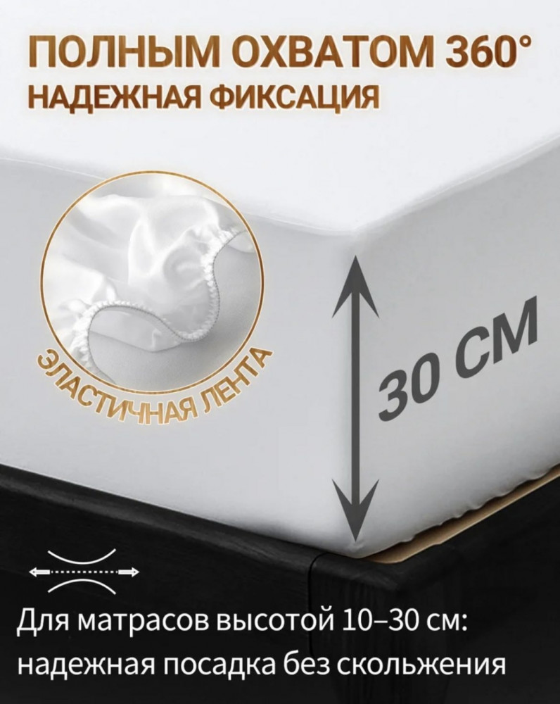 Идеальная посадка (Борт 30 см): Наматрасник надевается как натяжная простыня. Эластичная резинка по всему периметру плотно облегает матрас высотой до 30 см, защищая не только верх, но и боковые стороны от пыли и грязи. Простота в уходе: Чехол легко стирается в машинке, быстро сохнет и не требует глажки. Ткань износостойкая и не теряет своих свойств после стирок.