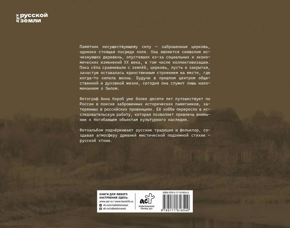 💳 Оплатить за товар можно при получении 🇰🇿 Есть бесплатная доставка по Казахстану от 1 дня 🎁 Копите бонусы с каждой покупки Серия: Дух русской земли Памятник несуществующему селу — заброшенная церковь, одиноко стоящая посреди поля. Она является символом исчезнувших деревень, опустевших из-за социальных и экономических изменений XX века, в том числе коллективизации. Пока сёла сравнивали с землёй, церковь, пусть и закрытая, зачастую оставалась единственным строением на месте, где когда-то кипела жизнь. Будучи в прошлом центрами общественной и духовной жизни, сегодня эти храмы служат лишь напоминанием о былом. |