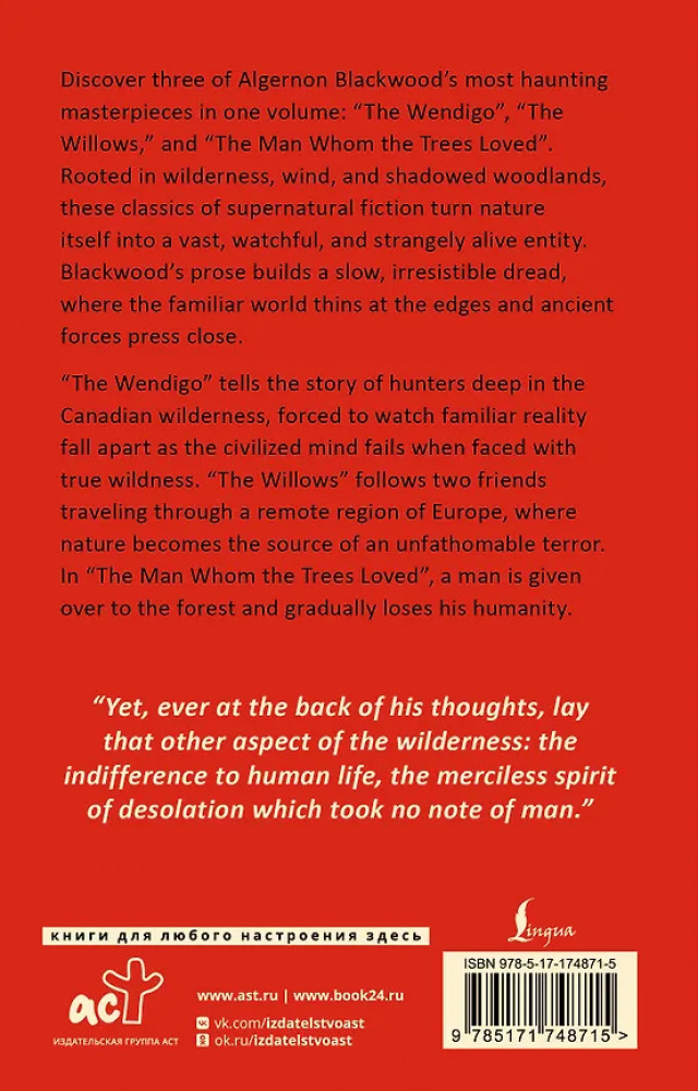💳 Оплатить за товар можно при получении 🇰🇿 Есть бесплатная доставка по Казахстану от 1 дня 🎁 Копите бонусы с каждой покупки Серия: Exclusive Classics Paperback Это сборник о том, как лес смотрит на человека — и как человек не выдерживает этого взгляда. В «The Wendigo» охота в канадской глуши превращается в кошмарный опыт встречи с древним духом леса, который ломает тело и сознание одного из героев, а вместе с ним — веру остальных в привычный, рациональный мир. В «The Willows» двое путешественников попадают в странный, почти нереальный пейзаж, где природа оживает, и шёпот ветра превращается в предвестие чего-то космически враждебного. В «The Man Whom the Trees Loved» тихая любовь к природе постепенно оборачивается одержимостью и медленным растворением человеческого «я» в воле леса. |