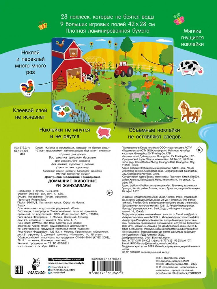 💳 Оплатить за товар можно при получении 🇰🇿 Есть бесплатная доставка по Казахстану от 1 дня 🎁 Копите бонусы с каждой покупки Серия: Книжка с наклейками, которые не боятся воды В подарочной книге «Домашние животные» — 9 больших игровых полей на плотной ламинированной бумаге и 28 многоразовых наклеек. Наклейки объёмные, вспененные, мягкие, хорошо гнутся. Их можно клеить и переклеивать хоть 100 раз — клеевой слой не исчезнет даже при соприкосновении с водой. Наклейки не мнутся, не рвутся и не оставляют следов. Есть специальная подложка, на которой удобно хранить наклейки, чтобы они не потерялись и были всегда под рукой. Прекрасное полиграфическое исполнение: книга большого формата, страницы с закруглёнными краями, обложка из мелованного картона. Книга безопасна и долговечна. На игровых разворотах малыш найдёт яркие летние картинки деревни и фермы, лабиринт, сказки и загадки, задания и подсказки. На каждом игровом поле можно использовать любое количество наклеек — даже все 28, всё зависит от фантазии. Игры с наклейками развивают логику и внимание, тренируют мелкую моторику, знакомят с окружающим миром, пробуждают творческие способности, совершенствуют речь. Для дошкольного возраста. |