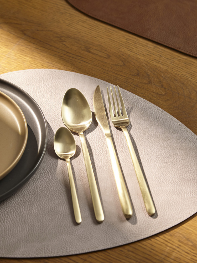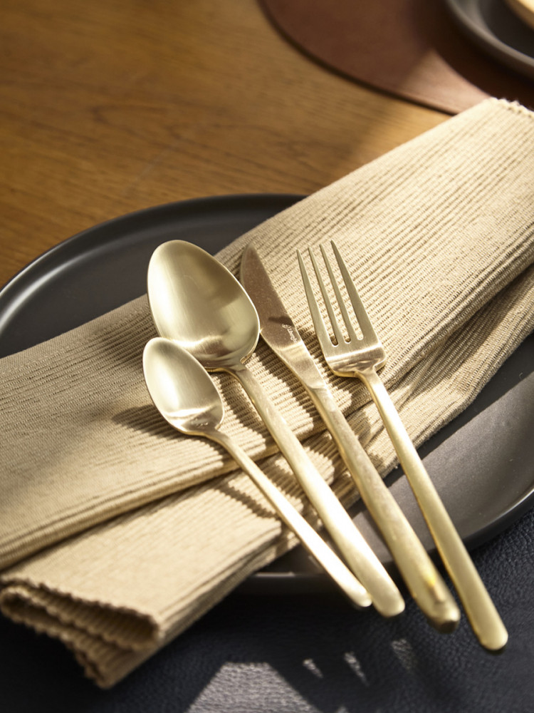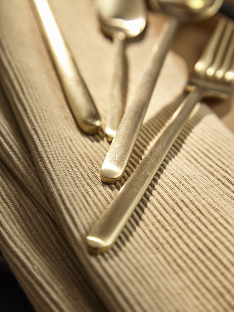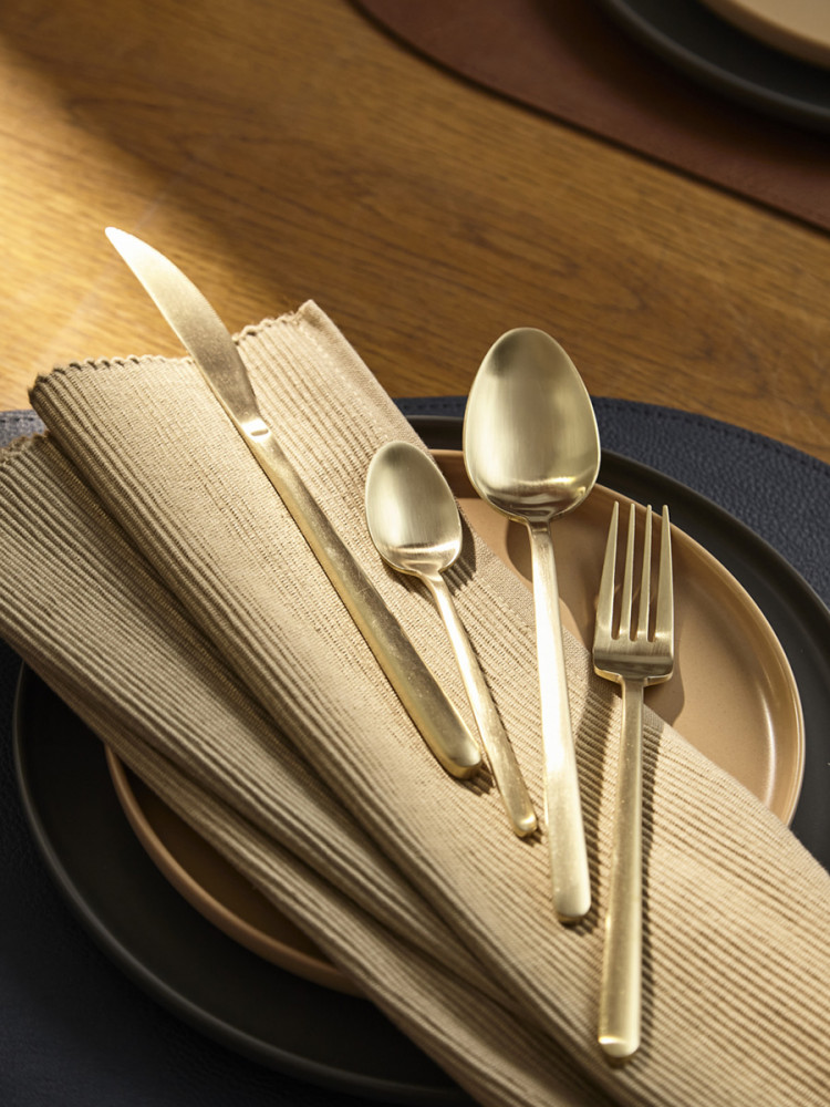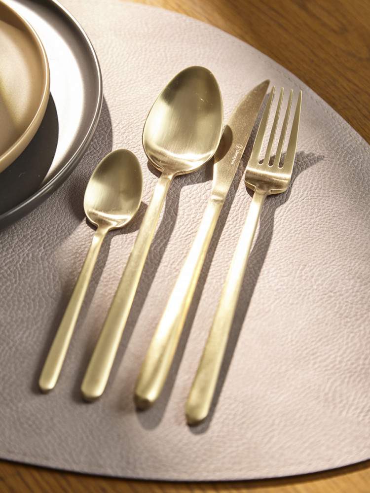 • столовые приборы золотистого цвета с матовой полировкой отлично подойдут для сервировки в традиционном и современном стиле. Их сдержанная элегантность прекрасно гармонирует с простыми формами и нейтральными цветами.
