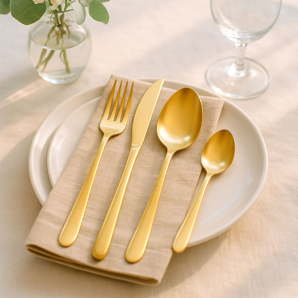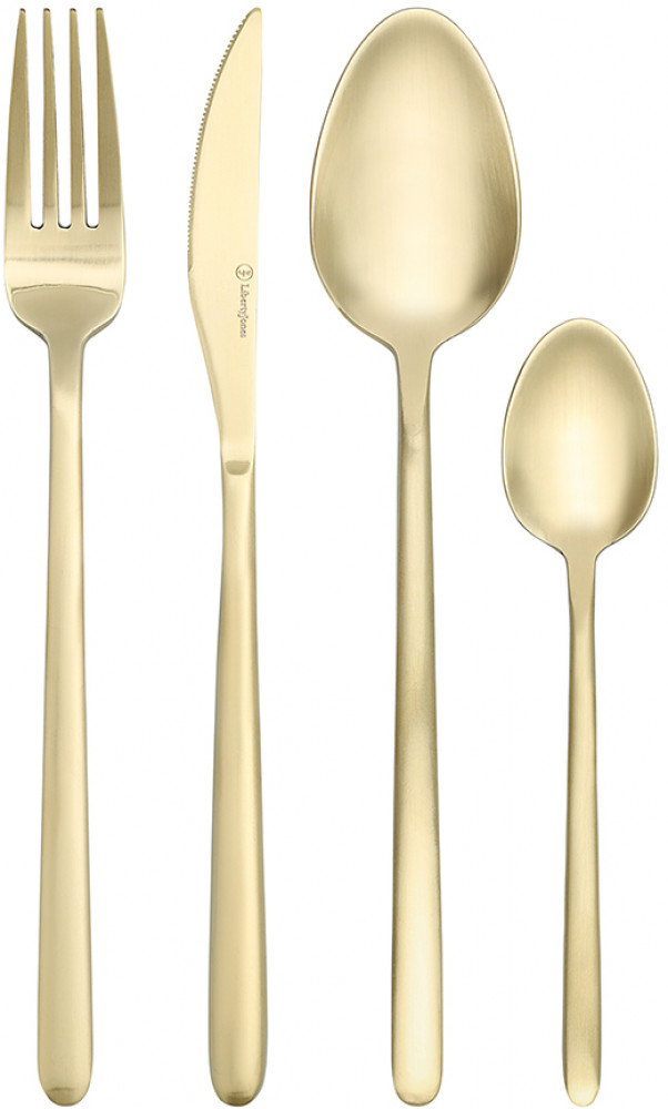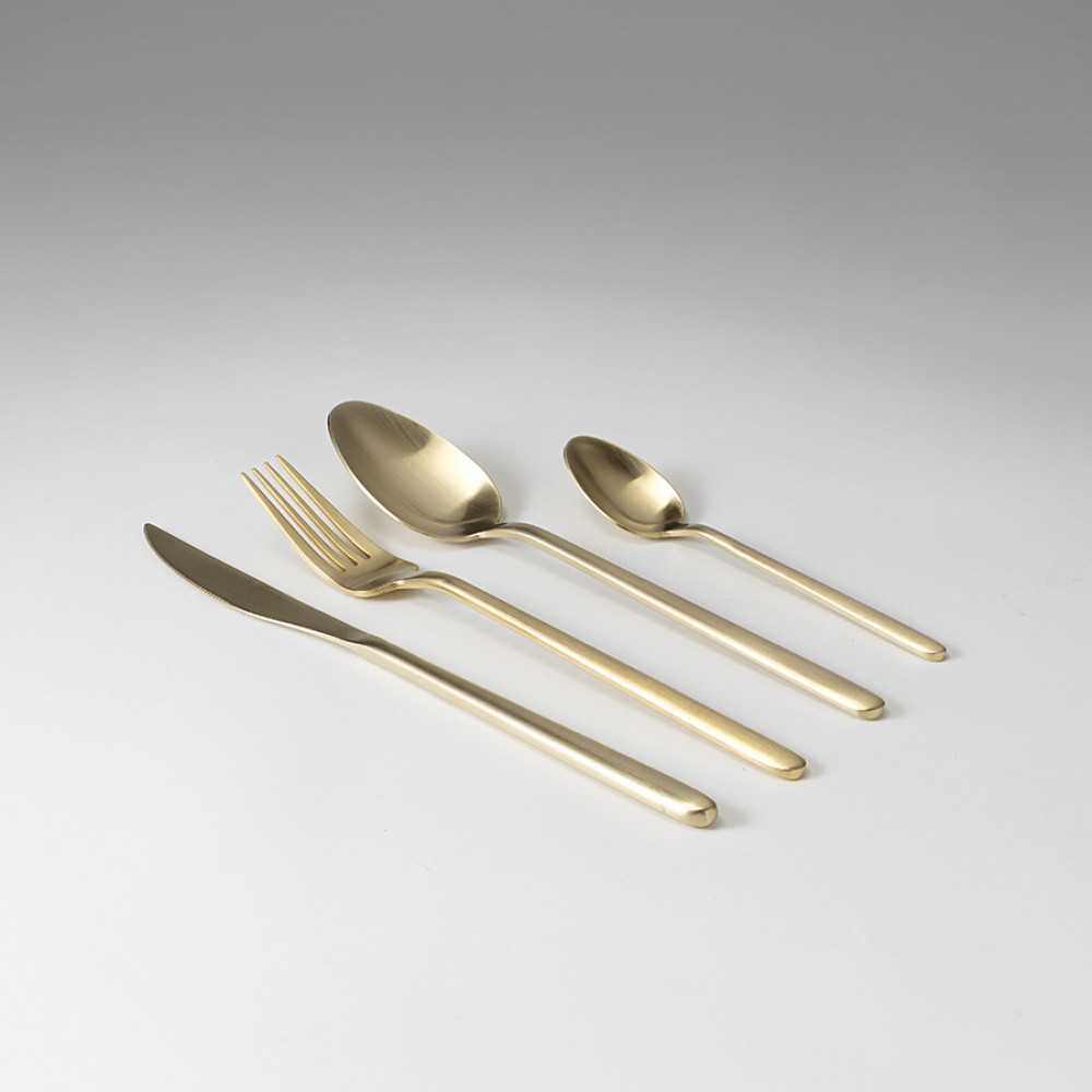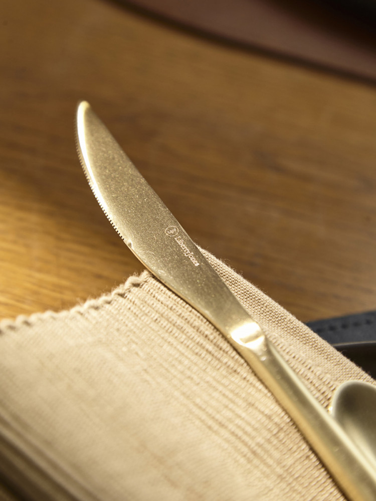 • столовые приборы золотистого цвета с матовой полировкой отлично подойдут для сервировки в традиционном и современном стиле. Их сдержанная элегантность прекрасно гармонирует с простыми формами и нейтральными цветами.