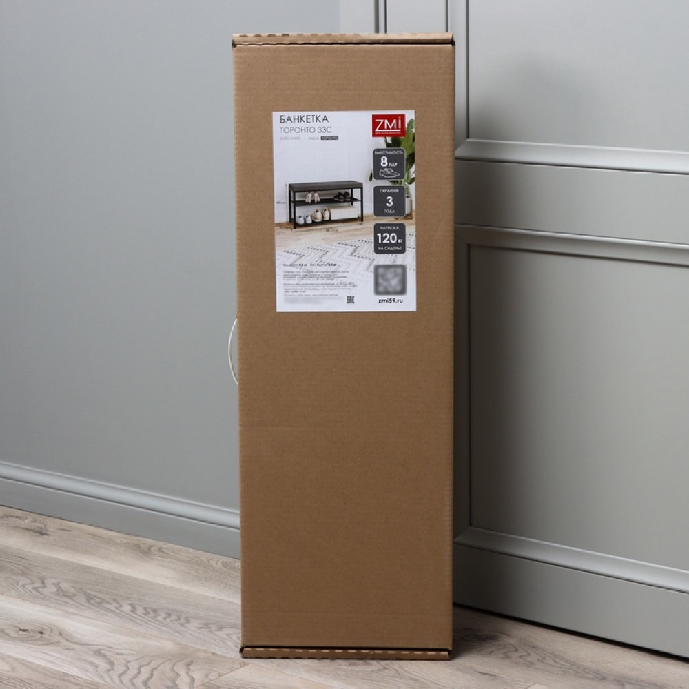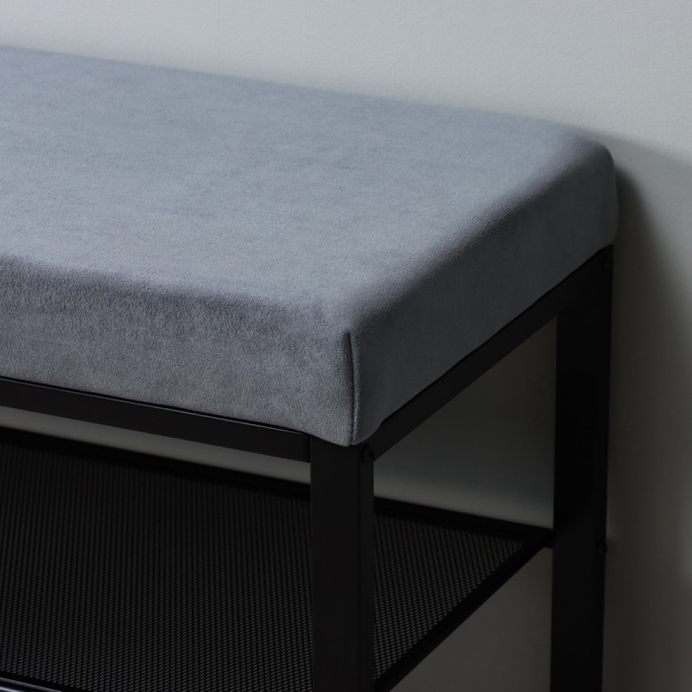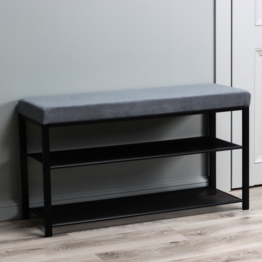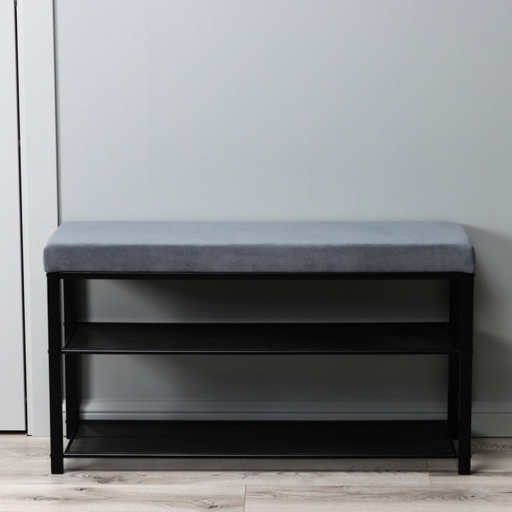 Банкетка – это отличный способ грамотной организации системы хранения ваших туфелек, ботинок или кроссовок! Напольное изделие компактного размера представляет собой каркас и полки из металла и мягкое сидение с наполнителем — поролоном. Металлические детали этажерки покрыты порошковой краской, которая образует при затвердевании непроницаемую полимерную пленку, препятствующую коррозии. Прочная банкетка имеет два яруса с горизонтальными «сетчатыми» полками, отверстия которых позволяют воздуху свободно циркулировать.
