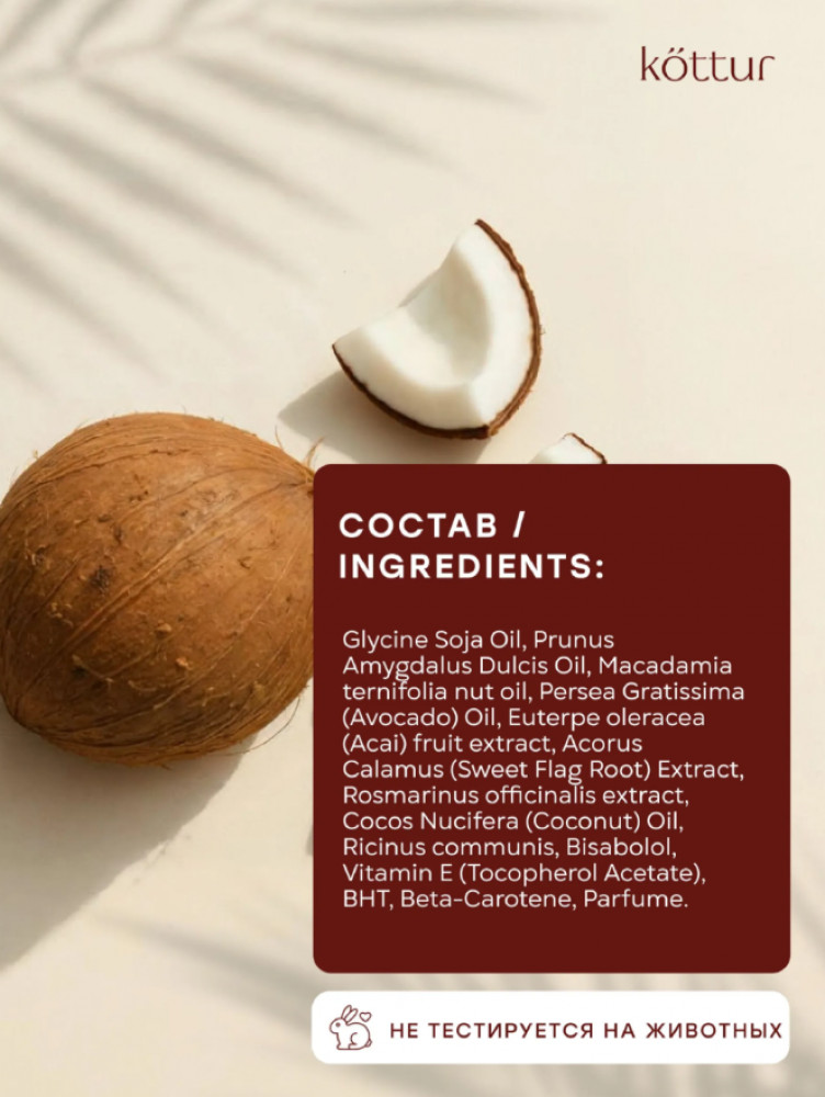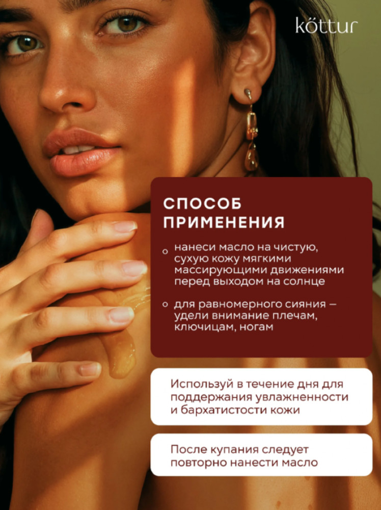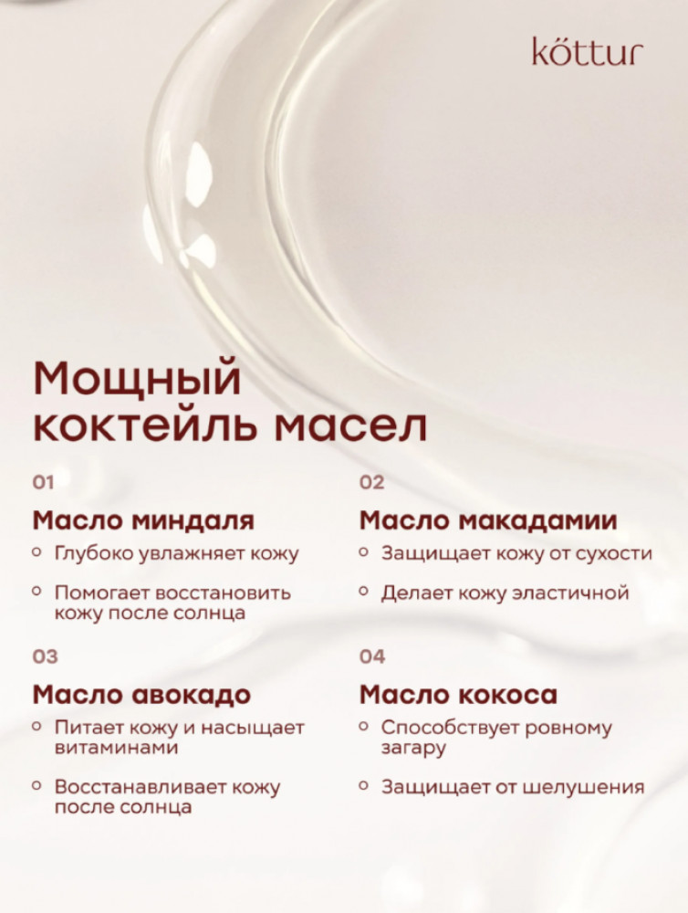💳 Оплатить за товар можно при получении 🇰🇿 Есть бесплатная доставка по Казахстану от 1 дня 🎁 Копите бонусы с каждой покупки Масло спрей для загара от бренда Köttur — это эффективное средство для загара на солнце, которое помогает быстро и безопасно приобрести ровный, золотистый оттенок кожи. Благодаря комплексу натуральных масел (кокосовое, миндальное, авокадо, макадамии) и витаминам Е и бета-каротину, масло интенсивно питает и увлажняет кожу, предотвращает сухость и шелушение. |
