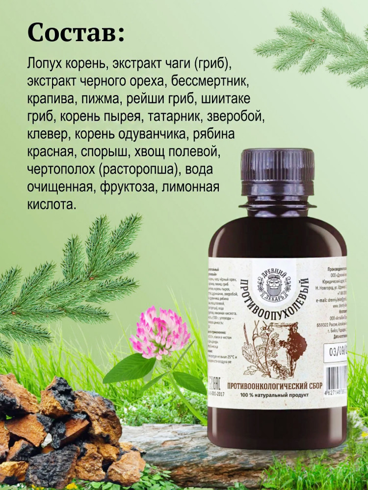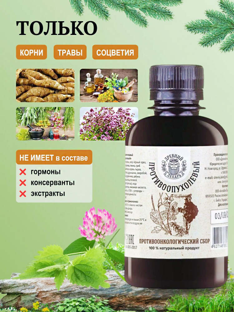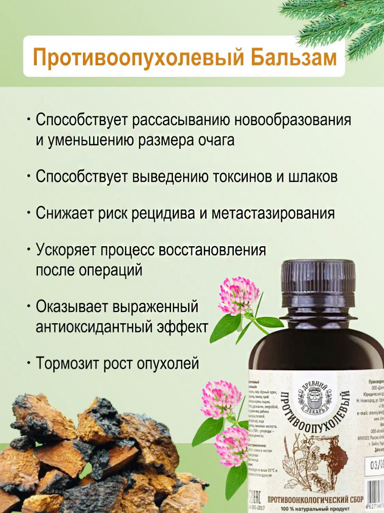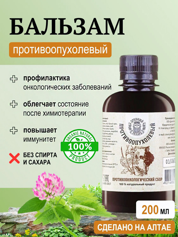 Травяной бальзам полезен в составе комплексной терапии при ранее выявленной онкологии (злокачественных опухолей), у больных на этапе прохождения лучевой или химиотерапии, а также назначается прошедшим лечение пациентам с целью снижения риска рецидива и метастазирования. Травяной бальзам способствует поднятию иммунитета.