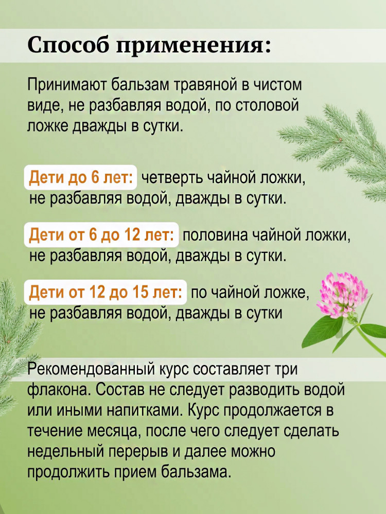 • курс продолжается в течение месяца, после чего следует сделать недельный перерыв и далее можно продолжить приём бальзама.