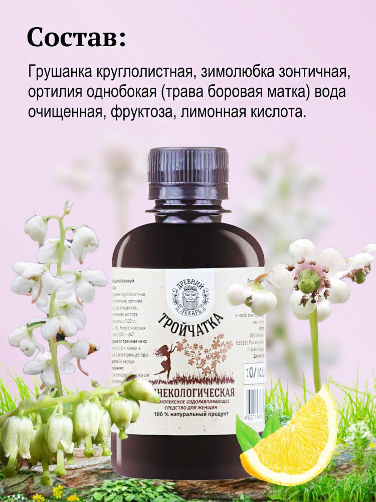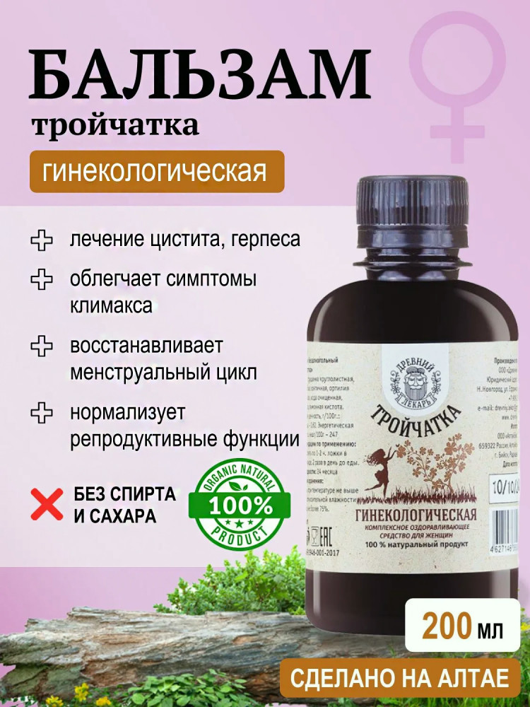 В комплексе эти травы для женщин считаются гинекологической тройчаткой. Такой травяной сбор для женщин в виде бальзама обладает свойствами, которые могут быть полезными для женской половой системы. Женский сбор помогает улучшить кровообращение и подавить бактериальную и вирусную флору, а также оказывает мягкий мочегонный эффект. Это особенно важно при воспалительных процессах в мочевыводящих путях и при мочекаменной болезни.