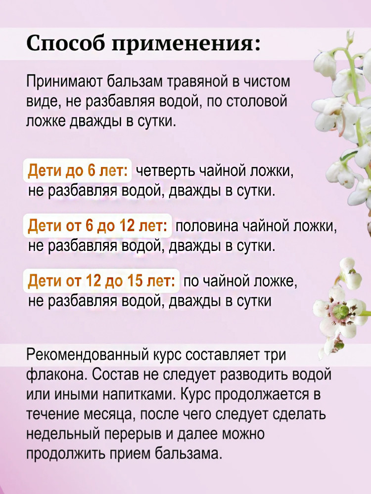 • курс продолжается в течение месяца, после чего следует сделать недельный перерыв и далее можно продолжить приём бальзама.
