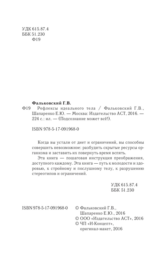Рефлексы идеального телаЕлена Юрьевна Шапаренко, Геннадий Вячеславович Фальковский В данный момент этот товар отсутствует в продаже. Возможно, у нас найдется аналогичный или похожий товар здесь. Серия: Подсознание может все! Когда люди слышат словосочетание «идеальное тело», у каждого в голове возникают свои фантазии. А вот возможностей достичь реальных результатов, увы, нет. Помните, как вы скрипели зубами от голода и ходили каждый вечер вокруг холодильника? Считали калории, пили препараты для похудения, ходили через силу в зал. |