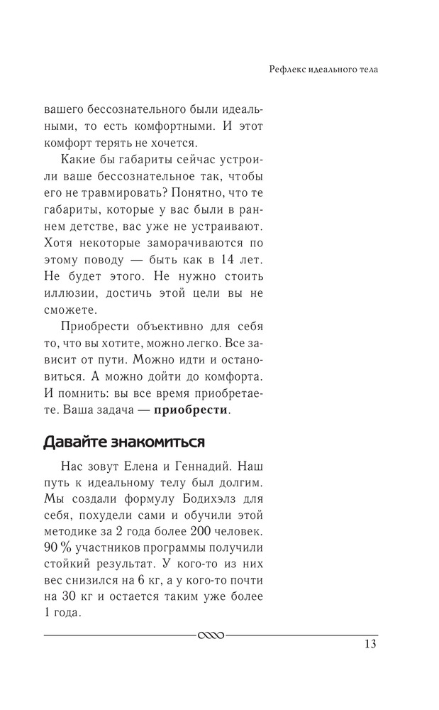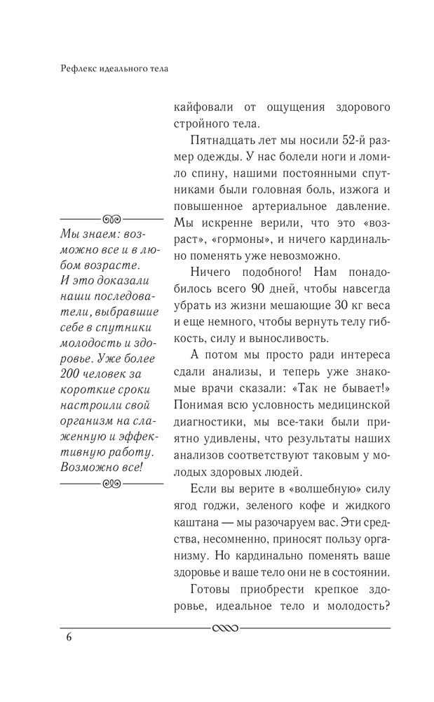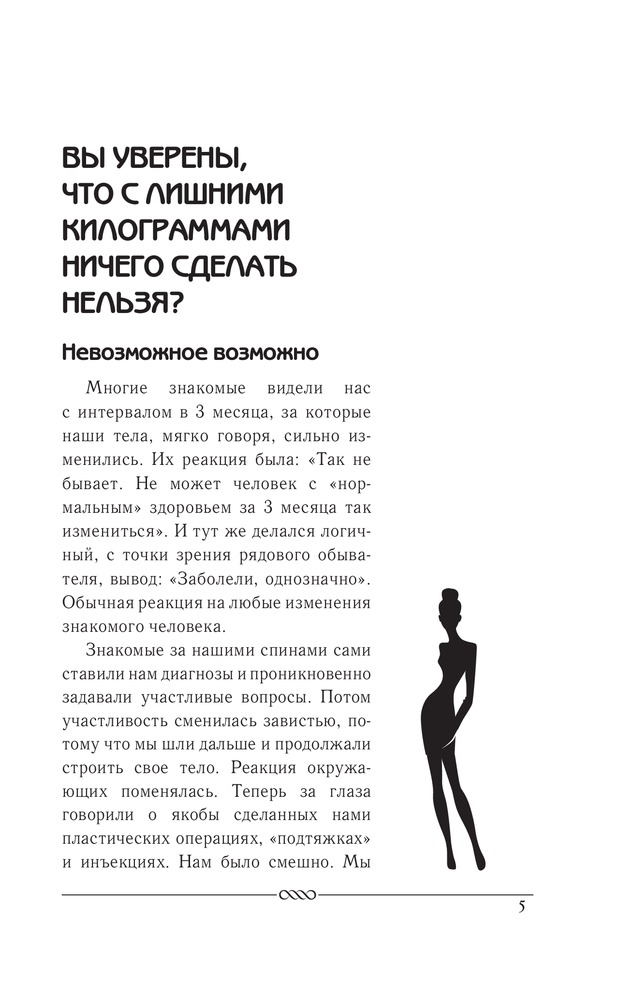 Для тех, кто серьезно настроен заняться своим весом и кто имеет 90 дней, чтобы посвятить их себе-любимому, эта книга просто руководство к действию! В ней есть не только убедительные теоретические выкладки, но и сама программа, затрагивающая психологические аспекты, режим питания, щадящие физические нагрузки, обливания... Авторы гарантируют, что пройдя через все это, ваш обмен веществ полностью перестроится и активизируется. И написано так, что им (авторам) веришь.