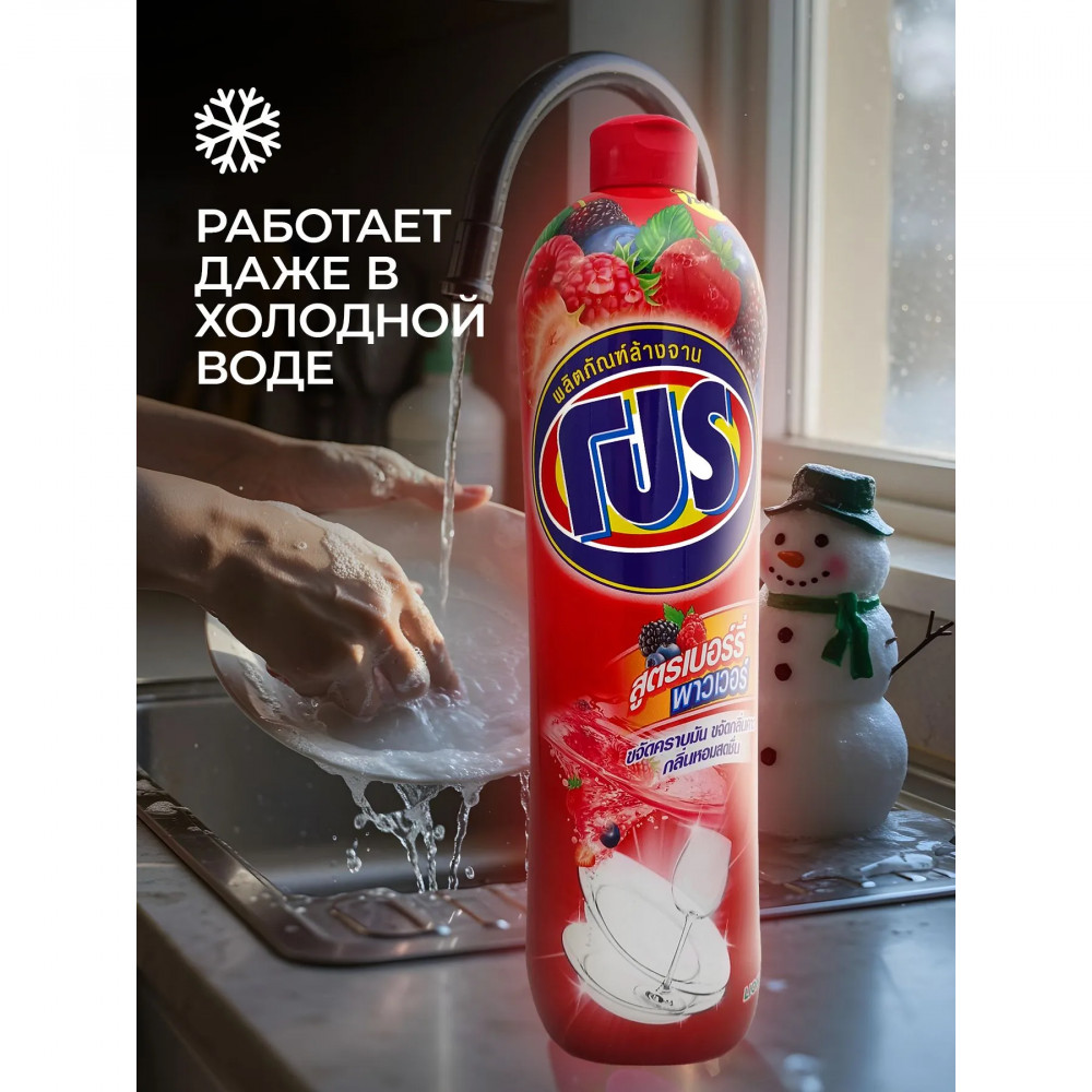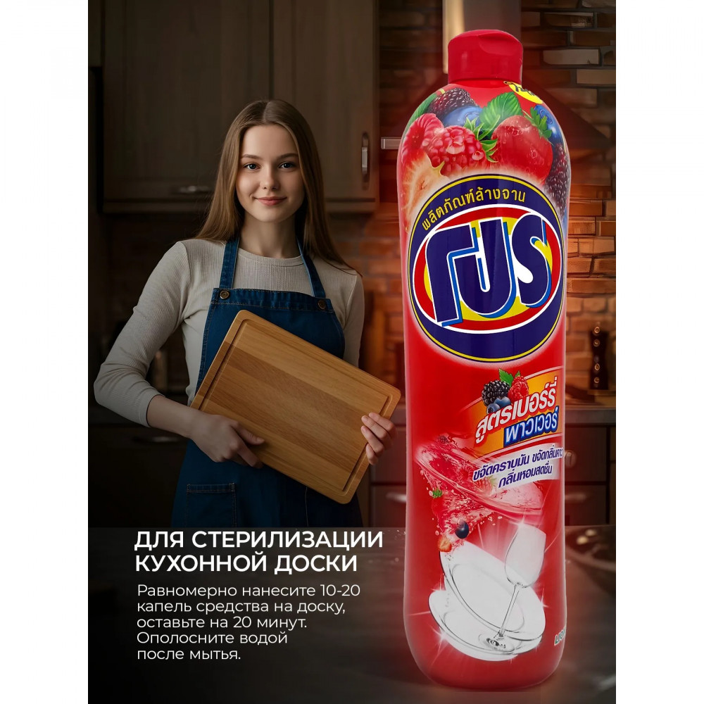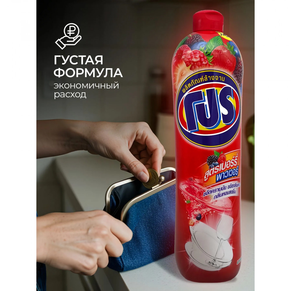 Мы также заботимся о вашей коже — наше средство не пересушивает и не раздражает ее во время мытья. И, конечно же, освежающий ягодный аромат оставит вашу посуду свежей и безупречной, удалив даже самые упрямые запахи, такие как рыбные запахи.