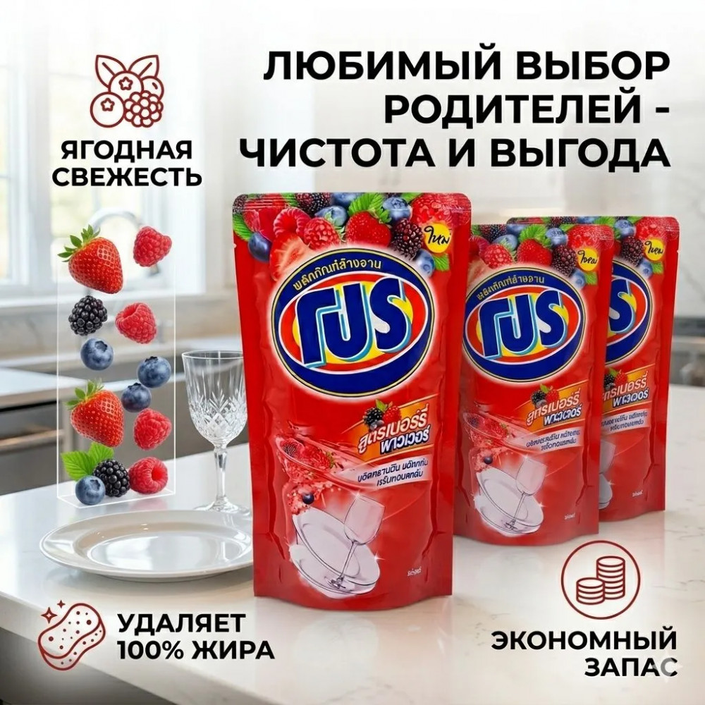 Мы также заботимся о вашей коже — наше средство не пересушивает и не раздражает ее во время мытья. И, конечно же, освежающий ягодный аромат оставит вашу посуду свежей и безупречной, удалив даже самые упрямые запахи, такие как рыбные запахи.