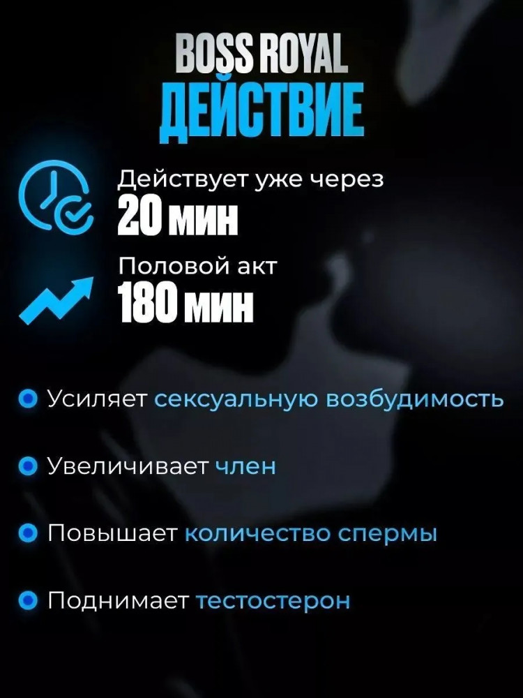 Boss Royal Viagra — препарат для потенции, позволяет легко и быстро достичь устойчивой эрекции, значительно продлевает половой акт, повышает либидо. Препарат действует быстро, эффективно и безопасно. Препарат Босс Роял Виагра включает в себя только натуральные компоненты: витаминный комплекс, животный тестостерон, экстракты трав из Тибета и Китая, грецкого ореха и женьшеня. Эти элементы легко усваиваются и могут прямо проникать в пещеристое тело пениса, увеличивая приток крови и повышая содержание тестостерона!