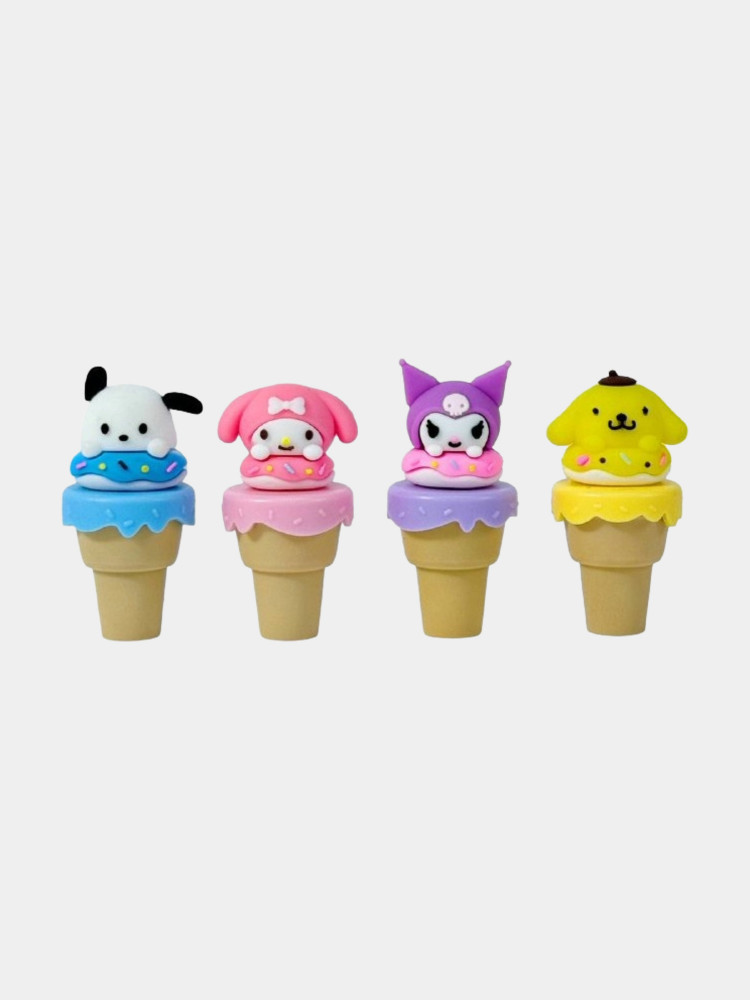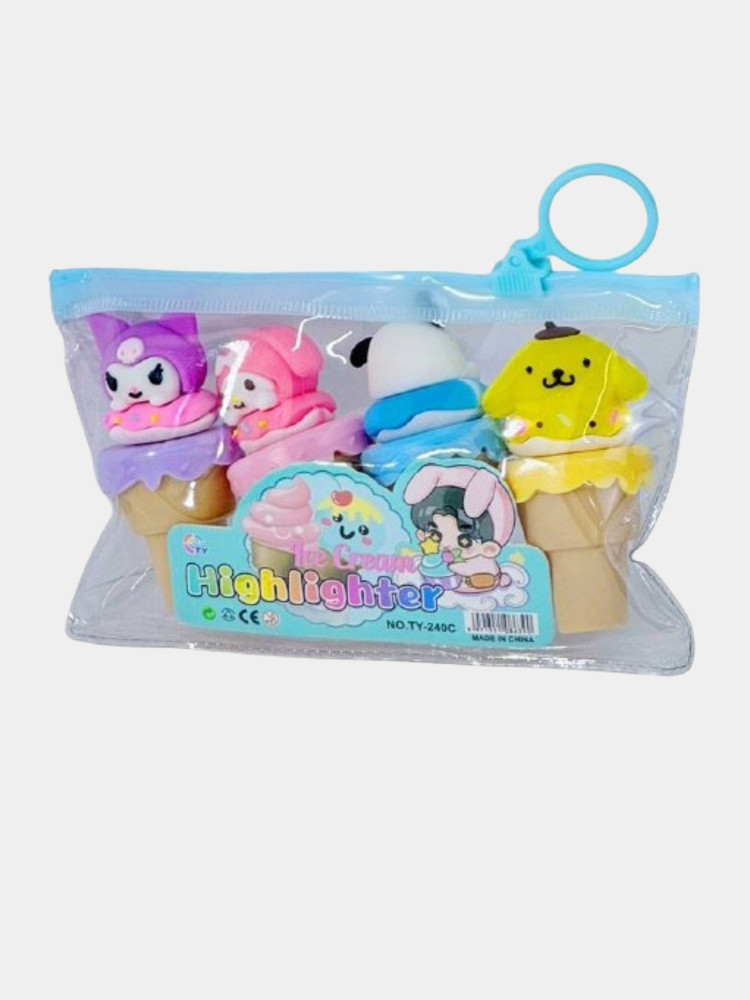 Набор текстовыделителей — 4 ярких небольших маркера (6 см) в виде рожков мороженого с объёмными фигурками в стиле кавайи. В наборе — куроми, май мелоди, похакко и помпомпурин. Милый дизайн радует глаз и поднимает настроение.