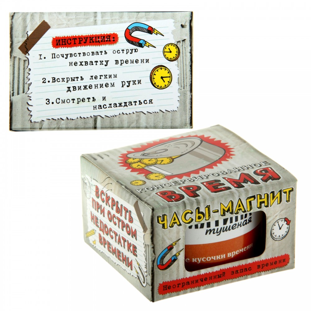 Часы-магнит в консервной банке «Тушеная времятина»В данный момент этот товар отсутствует в продаже. Возможно, у нас найдется аналогичный или похожий товар здесь. Как же порой не хватает времени… Удивите своих близких и друзей необычным подарком. Подарите им время в консервах! Это не шутка! Яркие, оригинальные, веселые |