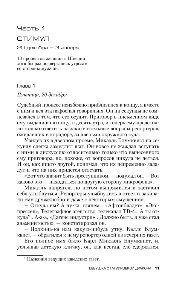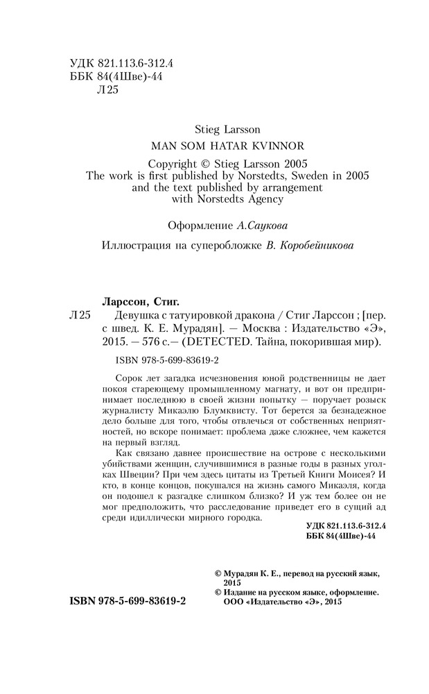 Девушка с татуировкой драконаВ данный момент этот товар отсутствует в продаже. Возможно, у нас найдется аналогичный или похожий товар здесь. Серия: DETECTED. Тайна, покорившая мир Сорок лет загадка исчезновения юной родственницы не дает покоя стареющему промышленному магнату, и вот он предпринимает последнюю в своей жизни попытку — поручает розыск журналисту Микаэлю Блумквисту. Тот берется за безнадежное дело больше для того, чтобы отвлечься от собственных неприятностей, но вскоре понимает: проблема даже сложнее, чем кажется на первый взгляд. |