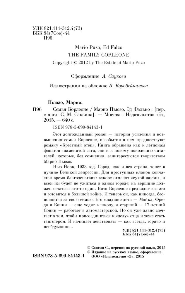 Семья КорлеонеВ данный момент этот товар отсутствует в продаже. Возможно, у нас найдется аналогичный или похожий товар здесь. Серия: Pocket Book (обложка) Этот долгожданный роман — история усиления и возвышения семьи Корлеоне, и события в нем предшествуют роману «Крестный отец». Книга обращена как к легионам фанатов знаменитой саги, так и к новому поколению читателей, которые, без сомнения, заинтересуются творчеством Марио Пьюзо. |