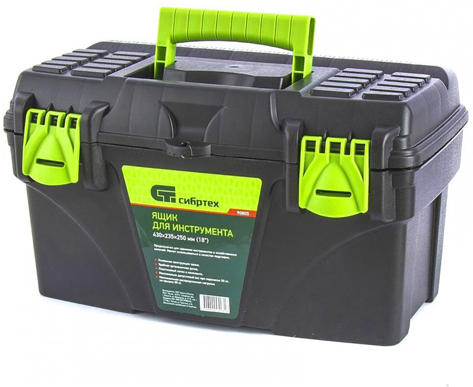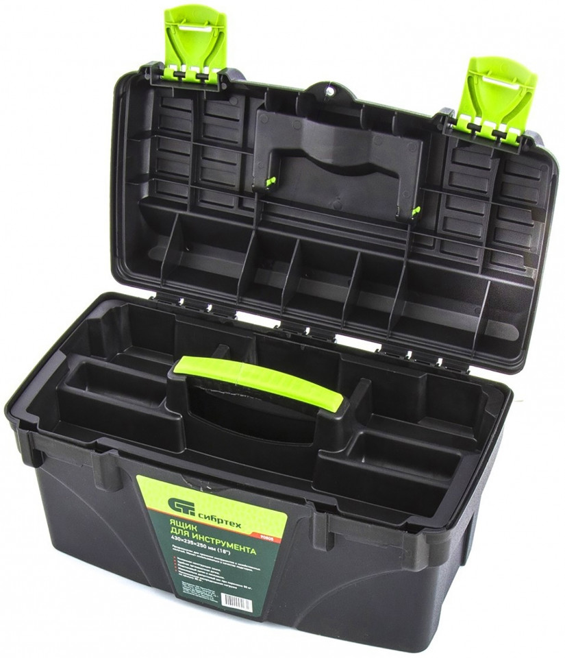 Ящик оборудован эргономичной ручкой для переноски, а петли крышки и ручки выдерживают его загрузку до 50 кг. С помощью трехрядных петель усилена конструкция замков и верхней крышки. Также, у ящиков «Сибртех» продумано внутреннее пространство: для хранения мелких деталей и небольшого инструмента имеется пластиковый вкладыш с ручкой. На корпусе крышки всех моделей нанесена линейка в дюймах и сантиметрах, что позволяет оперативно делать необходимые замеры.