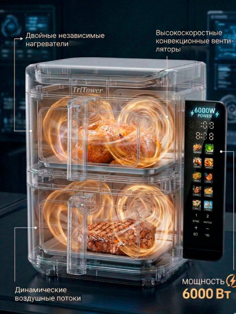 💳 Оплатить за товар можно при получении 🇰🇿 Есть бесплатная доставка по Казахстану от 1 дня 🎁 Копите бонусы с каждой покупки Аэрогриль-мультипечь TriTower TT-KA8110 — максимум мощности и свободы приготовления. Модель оснащена двумя независимыми корзинами по 5,5 литра (общий объём 11 л), что позволяет готовить два разных блюда одновременно. Вы можете настроить индивидуальную температуру и время для каждой зоны — удобно для семьи или приёма гостей. |