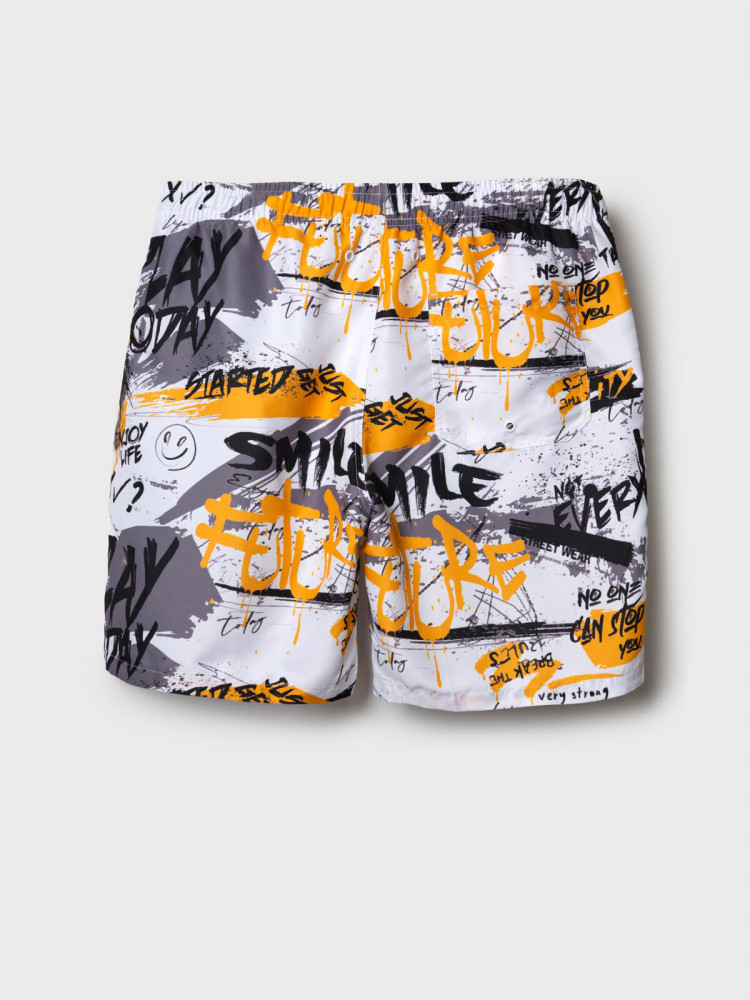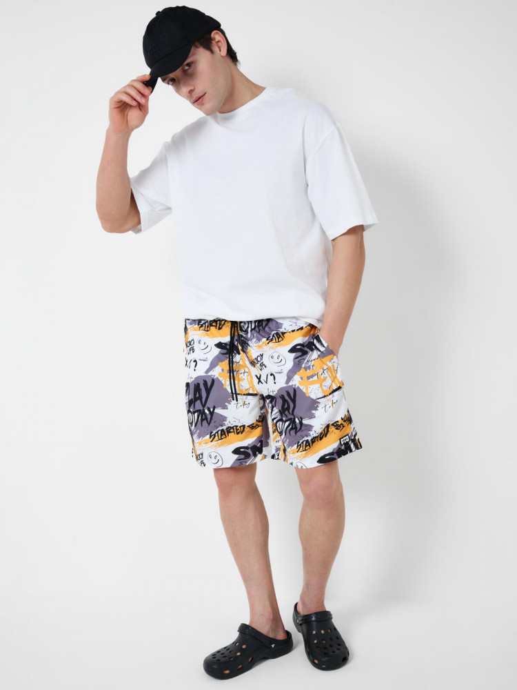 Мужские плавательные шорты средней длины. Модель имеет комфортную посадку и длину чуть выше колена. Пояс на резинке с утягивающим шнуром. Внутри — сетчатые трусы. Есть два боковых кармана и один накладной карман сзади с отверстием для слива. На передней части — силиконовая нашивка. Основной акцент - яркий принт с надписями в стиле граффити. Благодаря UF-защите, ткань сохраняет первоначальный вид даже при длительном пребывании на солнце. Подходит для плавания и активного отдыха.