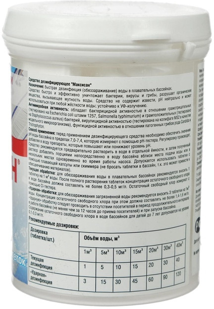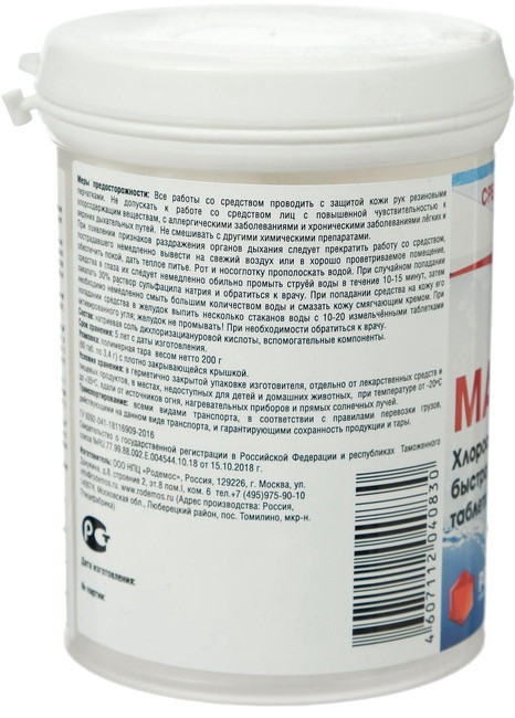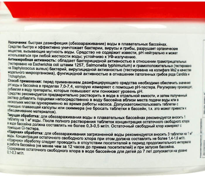 💳 Оплатить за товар можно при получении 🇰🇿 Есть бесплатная доставка по Казахстану от 1 дня 🎁 Копите бонусы с каждой покупки Дезинфицирующее средство, представляет собой хлорсодержащие быстрорастворимые таблетки. Предназначено для обеззараживания воды в системах хозяйственно-питьевого водоснабжения при централизованном водоснабжении, обеззараживания групповых запасов воды при нецентрализованном водоснабжении, а также емкостей для хранения воды, дезинфекции шахтных колодцев и обеззараживанию воды в них, обеззараживания воды плавательных бассейнов, дезинфекции различных объектов в помещениях бассейна (поверхности ванны бассейна, раздевальнях, душевых, резиновых ковриков, уборочного инвентаря и т.д.). Средство предназначено для применения специалистами предприятий, организаций, учреждений, деятельность которых связана с эксплуатацией плавательных бассейнов, а также работников дезинфекционных станций, других учреждений, имеющих право заниматься дезинфекционной деятельностью, населением в быту в соответствии с этикеткой для быта. |
