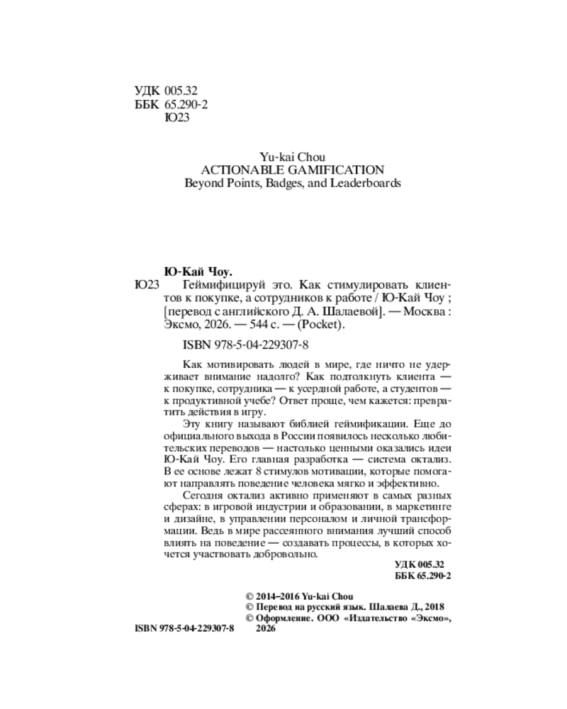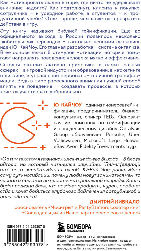 💳 Оплатить за товар можно при получении 🇰🇿 Есть бесплатная доставка по Казахстану от 1 дня 🎁 Копите бонусы с каждой покупки Серия: Бизнес. Pocket Как мотивировать людей в мире, где ничто не удерживает внимание надолго? Как подтолкнуть клиента к покупке, сотрудника — к усердной работе, а студентов — к продуктивной учебе? Ответ проще, чем кажется: превратить действия в игру. Эту книгу называют библией геймификации. Еще до официального выхода в России появилось несколько любительских переводов — настолько ценными оказались идеи Ю-Кай Чоу. Его главная разработка — система октализ. В ее основе лежат 8 стимулов мотивации, которые помогают направлять поведение человека мягко и эффективно. |