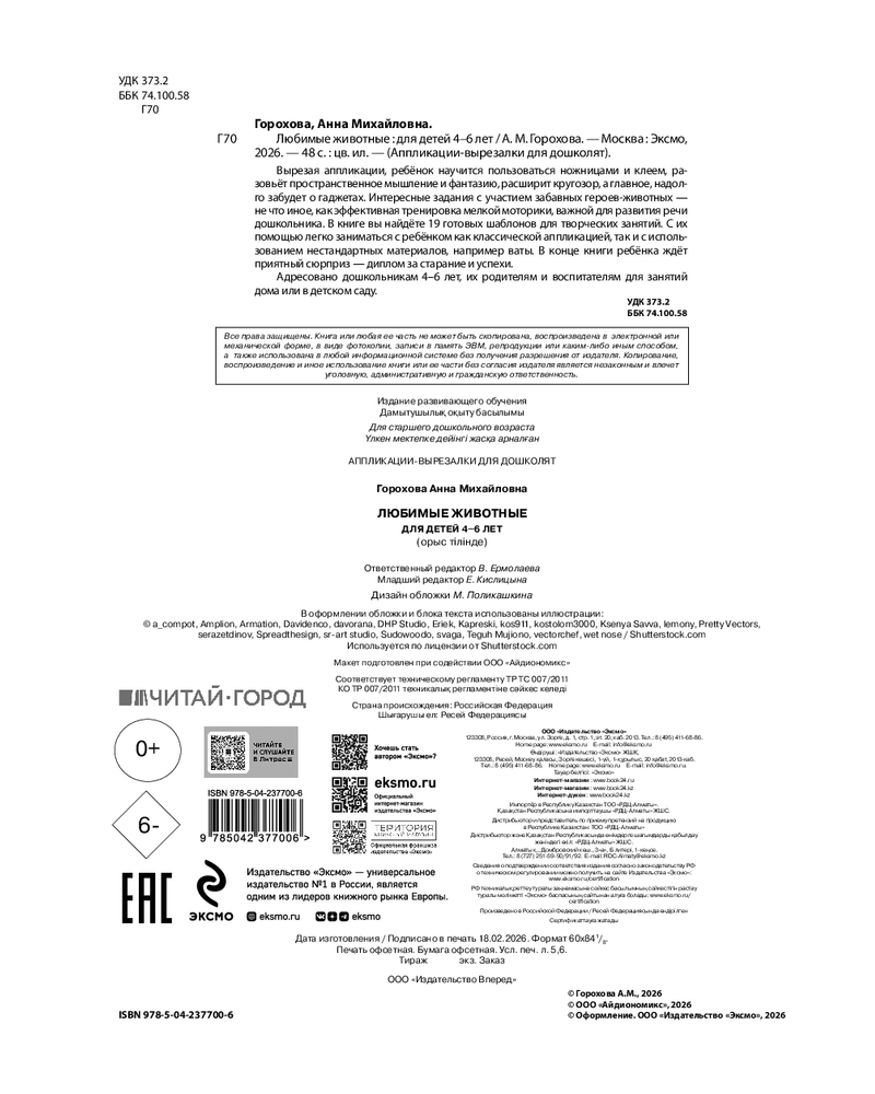 💳 Оплатить за товар можно при получении 🇰🇿 Есть бесплатная доставка по Казахстану от 1 дня 🎁 Копите бонусы с каждой покупки Серия: Аппликации-вырезалки для дошколят Новинка от издательства «Эксмо»! Пособие для детей 4, 5, 6 лет, созданное для развития и обучения без стресса, поможет ребёнку провести время с пользой и станет отличной заменой гаджетам. «Аппликация-вырезалка» предлагает дошкольнику увлекательные задания — вырезать из бумаги, работать с цветной бумагой и ватой. Благодаря ярким страницам и понятным заданиям ребёнок с радостью будет возвращаться к книге вновь. Занимаясь, ребёнок разовьёт мелкую моторику, внимание, логическое и пространственное мышление, воображение, расширит знания об окружающем мире — важные навыки для подготовки к школе. Обучение проходит легко, в игровой форме, формируя уверенность в своих силах. |