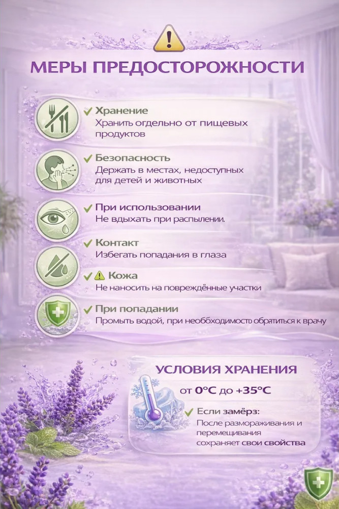 Меры предосторожности: хранить отдельно от пищевых продуктов, в местах, недоступных для людей и животных. Избегать вдыхания при распылении, попадания в глаза и на поврежденные участки кожи. В случае попадания на слизистые оболочки обильно промыть водой и при необходимости обратиться за медицинской помощью. Использовать строго по назначению.