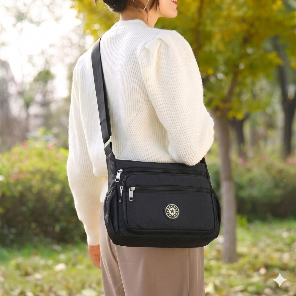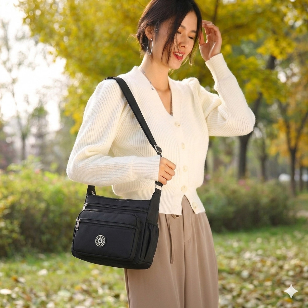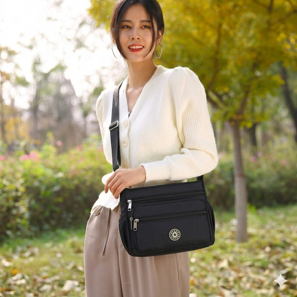 Стильная и практичная женская сумка через плечо — идеальный выбор для активных будней и путешествий! Сумка изготовлена из высококачественного мягкого нейлона и отличается легкостью и долговечностью. Водонепроницаемая ткань «оксфорд» с пропиткой защитит содержимое сумки от дождя и влаги. Легко чистится и не выцветает со временем. Несмотря на компактный вид, в сумку свободно помещаются: iPad, складной зонт, книги, косметичка и бутылка воды.