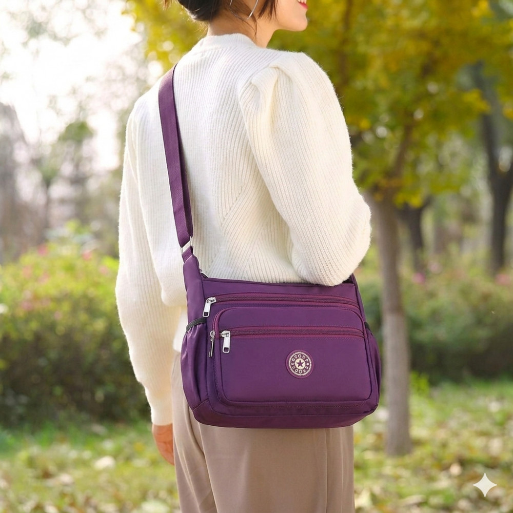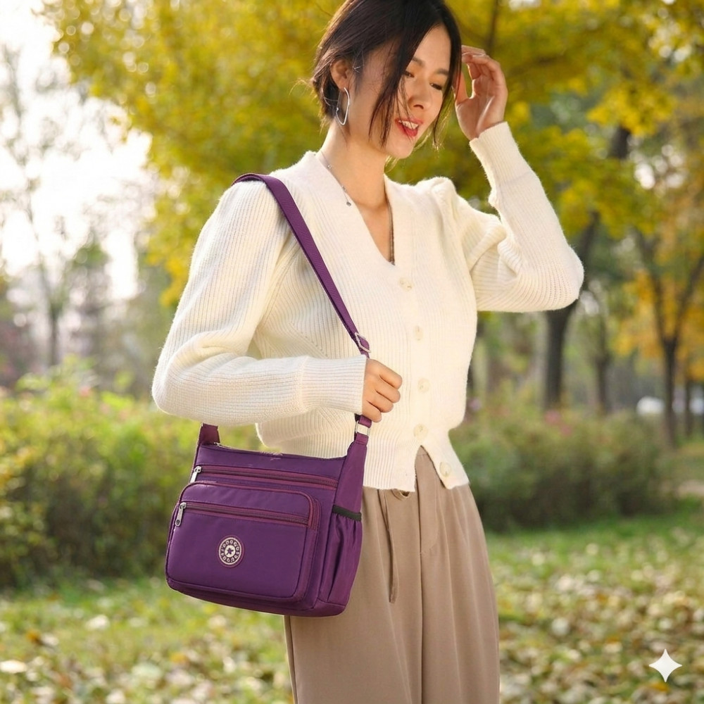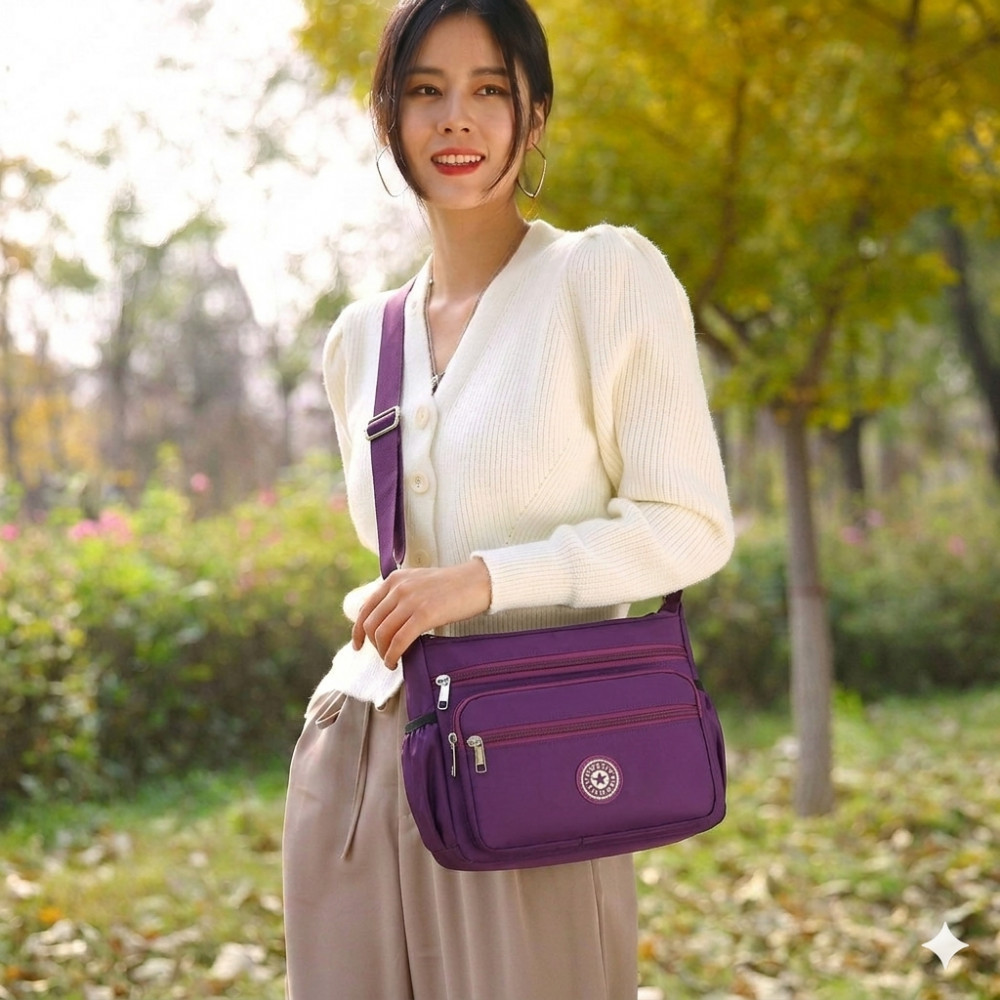 Стильная и практичная женская сумка через плечо — идеальный выбор для активных будней и путешествий! Сумка изготовлена из высококачественного мягкого нейлона и отличается легкостью и долговечностью. Водонепроницаемая ткань «оксфорд» с пропиткой защитит содержимое сумки от дождя и влаги. Легко чистится и не выцветает со временем. Несмотря на компактный вид, в сумку свободно помещаются: iPad, складной зонт, книги, косметичка и бутылка воды.