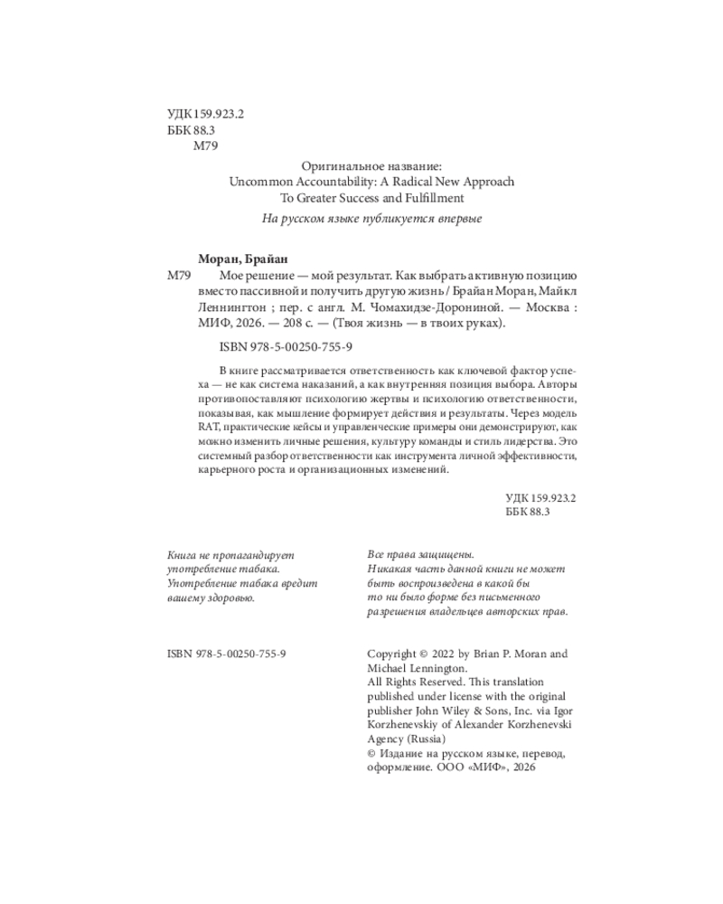 Серия: Твоя жизнь — в твоих руках Большинство людей воспринимают ответственность как давление и контроль. Когда тебя наказывают, когда ты кому-то должен, когда нельзя ошибаться. Брайан Моран и Майкл Леннингтон, авторы книги и легендарной системы «12 недель в году», предлагают взглянуть на это слово иначе.