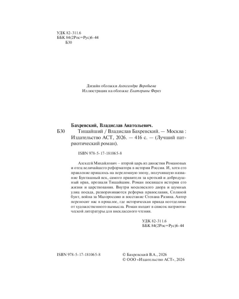 💳 Оплатить за товар можно при получении 🇰🇿 Есть бесплатная доставка по Казахстану от 1 дня 🎁 Копите бонусы с каждой покупки Серия: Лучший патриотический роман Алексей Михайлович — второй царь из династии Романовых и отец величайшего реформатора в истории России. И хотя его правление пришлось на переломную эпоху, получившую название Бунташный век, самого правителя за кроткий и добродушный нрав прозвали Тишайшим. Роман посвящен истории его жизни и царствования. Внутри московского двора и шумных улиц посада разворачиваются реформа православия, Соляной бунт, война за Малороссию и восстание Степана Разина. Автор переносит нас в прошлое, где историческая правда неотделима от художественного вымысла. Роман входит в список патриотической литературы для внеклассного чтения. |