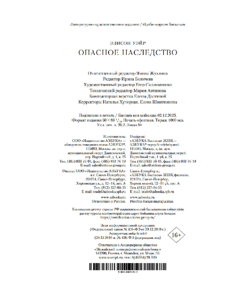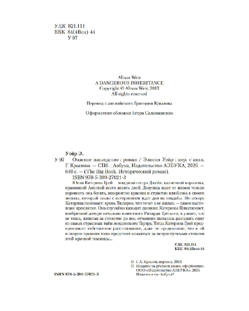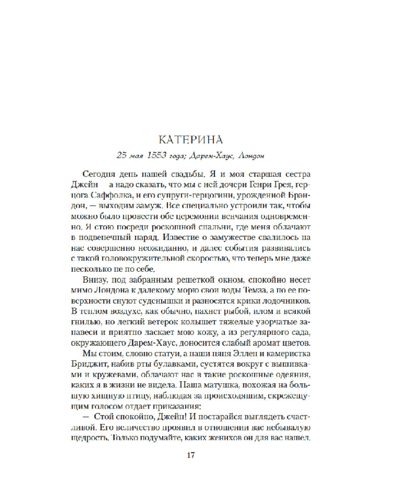 💳 Оплатить за товар можно при получении 🇰🇿 Есть бесплатная доставка по Казахстану от 1 дня 🎁 Копите бонусы с каждой покупки Серия: The Big Book. Исторический роман Юная Катерина Грей — младшая сестра Джейн, казненной королевы, правившей Англией всего девять дней. Девушка ждет от жизни только хорошего: она богата, невероятно красива и страстно влюблена в своего жениха, который также с нетерпением ждет дня их свадьбы. Но вскоре Катерина понимает: кровь Тюдоров, что течет в ее жилах, — самое настоящее проклятие. Она случайно находит дневник Катерины Плантагенет, внебрачной дочери печально известного Ричарда Третьего, и узнает, что ее тезка, жившая за столетие до нее, отчаянно пыталась разгадать одну из самых страшных тайн лондонского Тауэра. Тогда Катерина Грей предпринимает собственное расследование, даже не предполагая, что и ей в скором времени тоже предстоит оказаться за неприступными стенами этой мрачной темницы... |