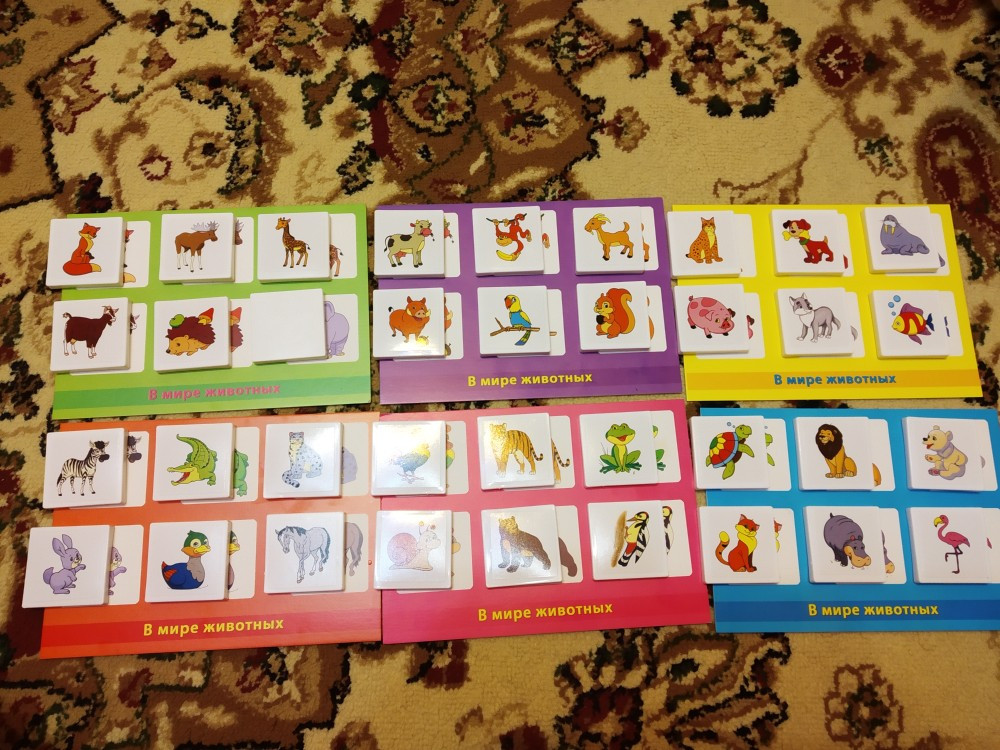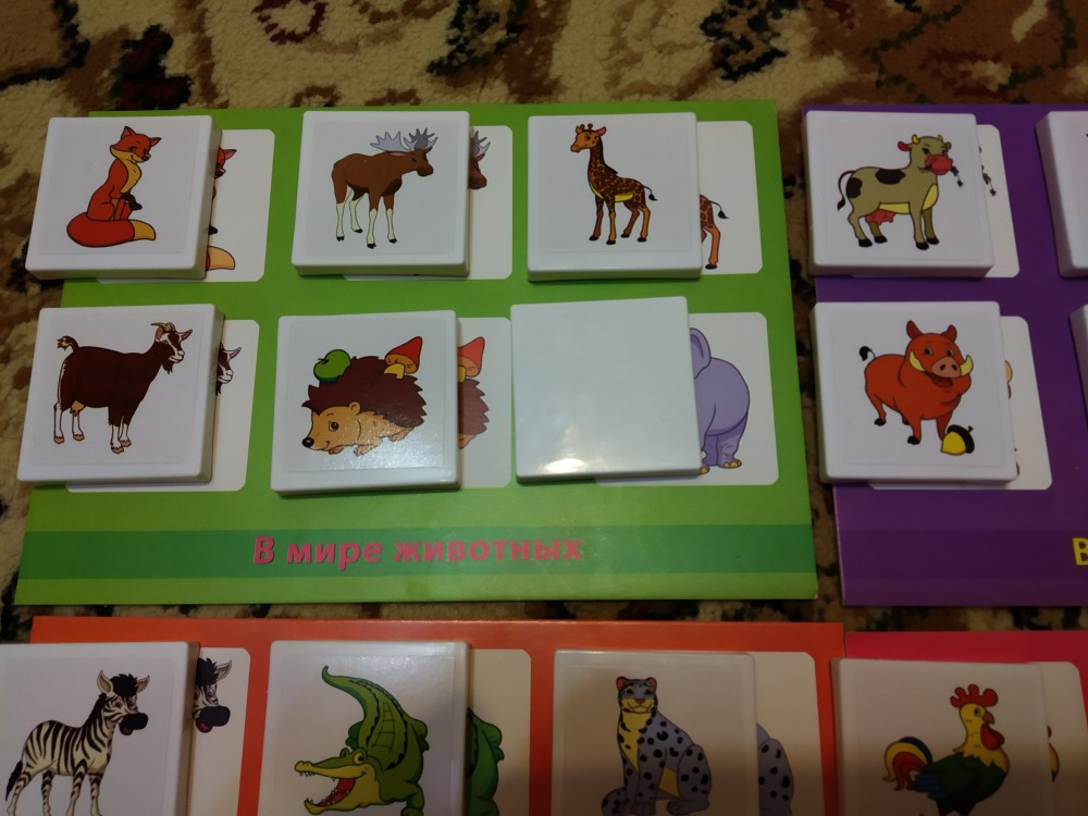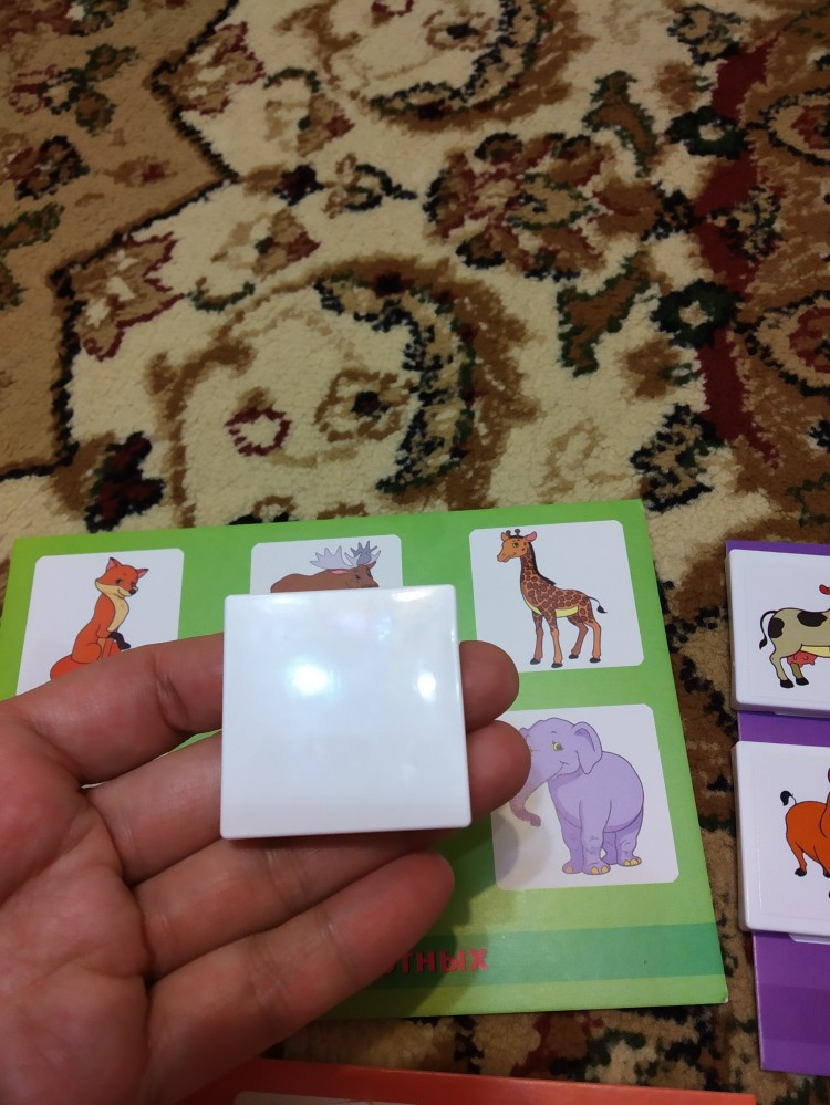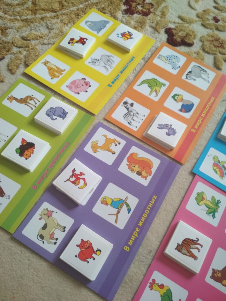 Очень хорошая игра для деток! В коробочке 6 карточек, на которой рисунки зверят. Сами фишки - пластмассовые. Сыну очень понравилось, да и мне тоже!