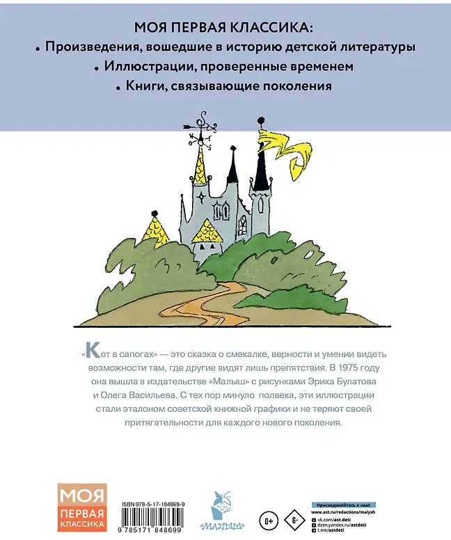 💳 Оплатить за товар можно при получении 🇰🇿 Есть бесплатная доставка по Казахстану от 1 дня 🎁 Копите бонусы с каждой покупки Серия: Моя первая классика Сказка французского писателя Шарля Перро «Кот в сапогах» с иллюстрациями русских художников Э. Булатова и О. Васильева радует уже не одно поколение маленьких читателей. Она идеально подойдёт для совместного чтения взрослых и малышей. За основу этого издания взята книга издательства «Малыш» 1975 года. Для детей до 3-х лет. |