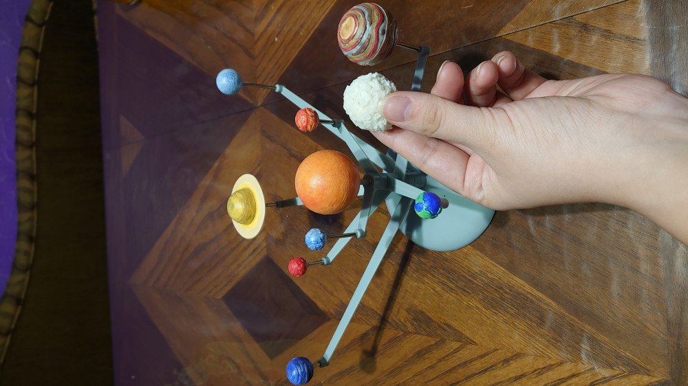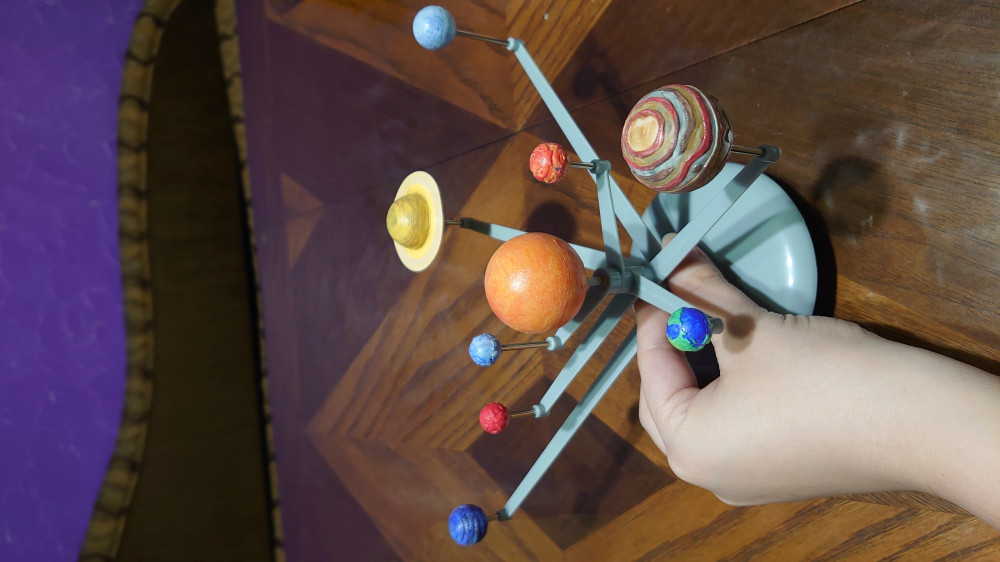 Сын был занят собиранием два вечера. Получилась хорошая модель солнечной системы. Уже носил в школу и получил пятерку. В данный момент стоит в его комнате, как сувенир.
