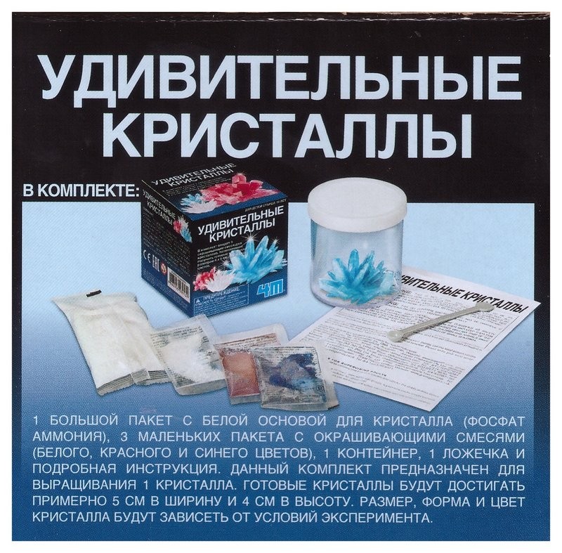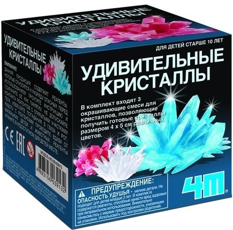 4М Удивительные кристаллы «Мультицвет»В данный момент этот товар отсутствует в продаже. Возможно, у нас найдется аналогичный или похожий товар здесь. Серия: Удивительные эксперименты Кристаллы – это вещества, мельчайшие частицы которых размещены в определённом порядке. Поэтому при росте кристалла на его поверхности возникают плоские грани, а сами кристаллы принимают различные геометрические формы. Многие учёные, которые внесли большой вклад в развитие таких наук как химия, минералогия начинали свои исследования именно с выращивания кристаллов. Повторить путь известных учёных сможет и ваш ребёнок. В этом ему поможет научно-познавательный набор для выращивания кристаллов "Удивительные кристаллы. Мультицвет" от бренда 4М. |