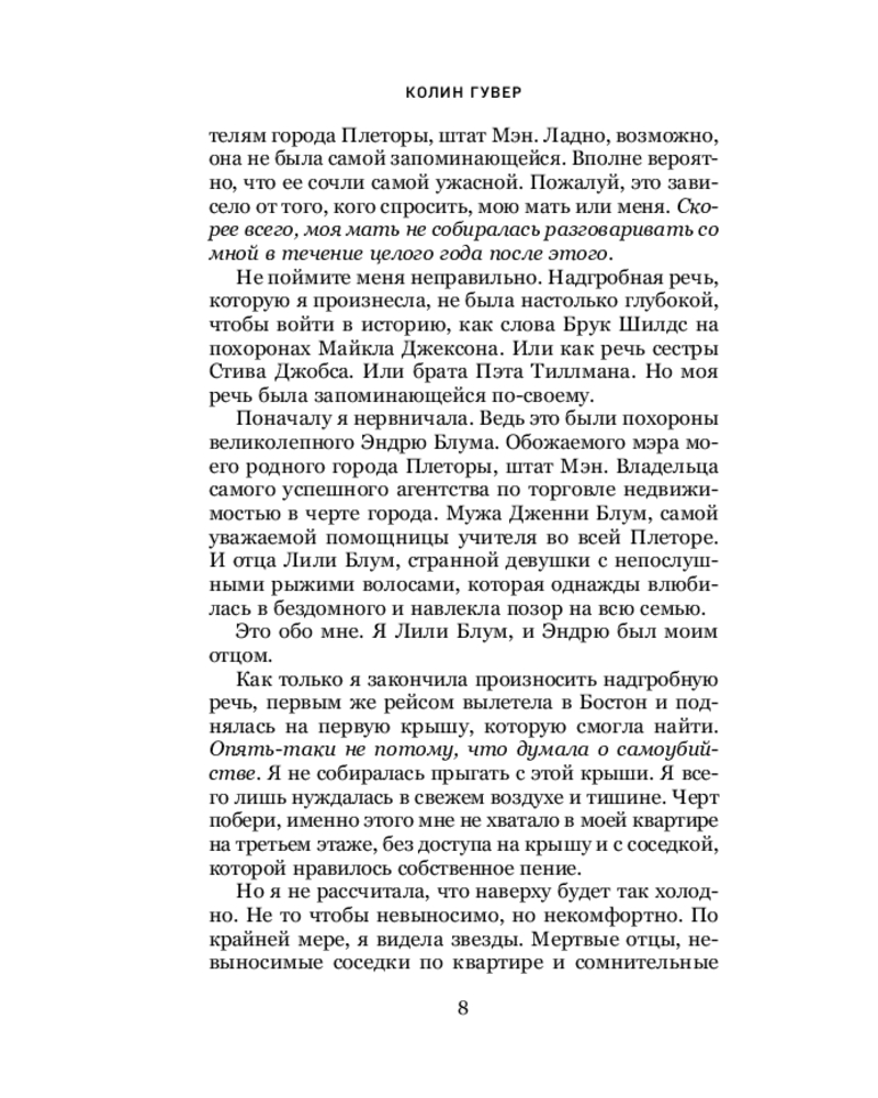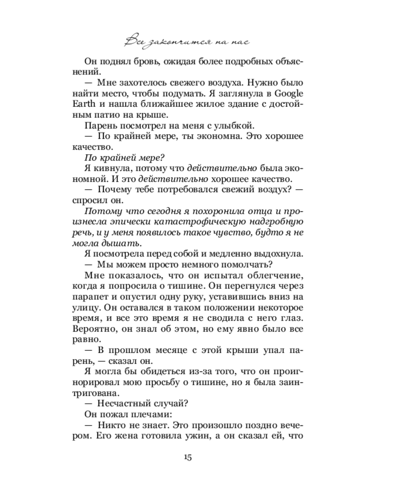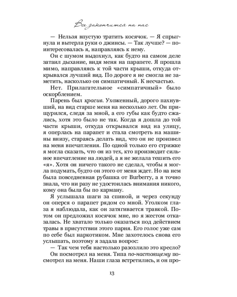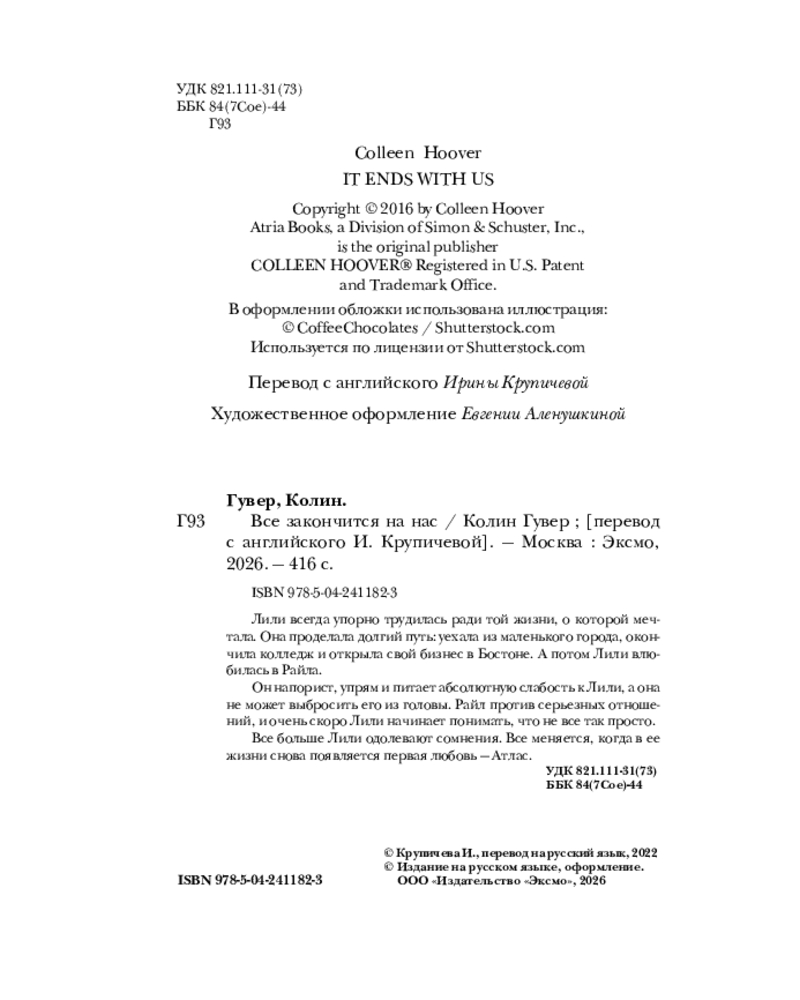 💳 Оплатить за товар можно при получении 🇰🇿 Есть бесплатная доставка по Казахстану от 1 дня 🎁 Копите бонусы с каждой покупки Серия: Все твои совершенства. Главные романы Колин Гувер «Всё закончится на нас» — драматическая история взаимоотношений влюбленной пары с неожиданным финалом. Это история не о любви. Это история о том, как от нее спастись. Роман высоко оценили как зарубежные, так и российские читатели. Готовится экранизация Sony Pictures с Блейк Лайвли в главной роли. Лилия — главный цветок этой книги. Что будет, если посмотреть на прекрасный цветок под другим углом? Обнажить его неприглядную сторону, прославляющую не только жизнь, но и смерть, не только начало, но и конец. Добавятся новые образы, новые смыслы, но он не перестанет быть прекрасным. Эти цветы Райл дарит Лили, чье имя только добавляет им значимости. |