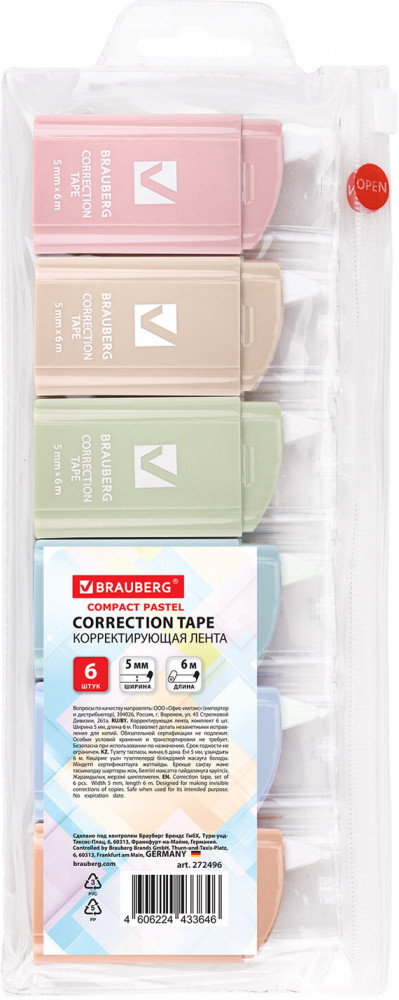 💳 Оплатить за товар можно при получении 🇰🇿 Есть бесплатная доставка по Казахстану от 1 дня 🎁 Копите бонусы с каждой покупки Корректирующая лента Brauberg Compact Pastel — это незаменимый помощник для мгновенного исправления рукописных и печатных текстов. Набор из 6 штук в ПВХ-пенале в трендовых пастельных дизайнах — идеальный выбор для дома, офиса или учебы. С помощью корректирующей ленты Brauberg вы сможете легко и незаметно исправлять любые копии, тексты и документы. Она не требует времени на высыхание после нанесения, что делает её особенно удобной в использовании. Кроме того, она не оставляет следов и черных полос на документе при копировании или отправке по факсу, обеспечивая плотное и равномерное покрытие. |