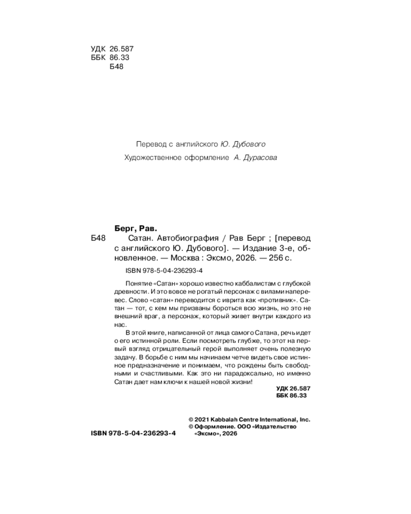 💳 Оплатить за товар можно при получении 🇰🇿 Есть бесплатная доставка по Казахстану от 1 дня 🎁 Копите бонусы с каждой покупки Серия: Каббала На основе трудов Рава Берга. Понятие «Сатан» хорошо известно каббалистам с глубокой древности. И это вовсе не рогатый персонаж с вилами наперевес. Слово «сатан» переводится с иврита как «противник». Сатан — тот, с кем мы призваны бороться всю жизнь, но это не внешний враг, а персонаж, который живет внутри каждого из нас. В этой книге, написанной от лица самого Сатана, речь идет о его истинной роли. Если посмотреть глубже, то этот на первый взгляд отрицательный герой выполняет очень полезную задачу. В борьбе с ним мы начинаем четче видеть свое истинное предназначение и понимаем, что рождены быть свободными и счастливыми. Как это ни парадоксально, но именно Сатан дает нам ключи к нашей новой жизни! |