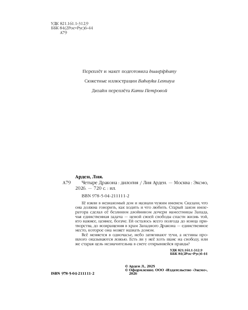 💳 Оплатить за товар можно при получении 🇰🇿 Есть бесплатная доставка по Казахстану от 1 дня 🎁 Копите бонусы с каждой покупки Серия: Лия Арден. Коллекция Её взяли в незнакомый дом и назвали чужим именем. Сказали, что она должна говорить, как ходить и что любить. Старый закон императора сделал её безликим двойником дочери наместницы Запада, чья единственная задача — ценой своей свободы спасти жизнь той, кто важнее, ценнее, богаче. Ей осталось всего полгода до конца притворства, до возвращения в храм Западного Дракона — единственное место, которое она может назвать домом. |