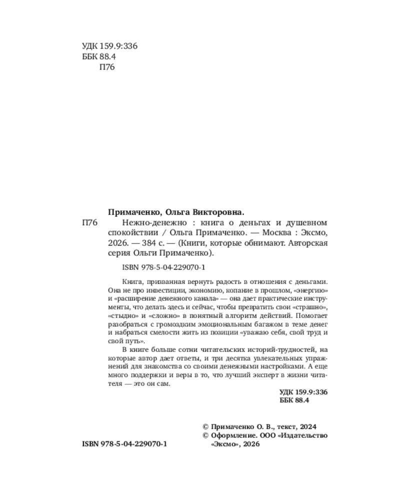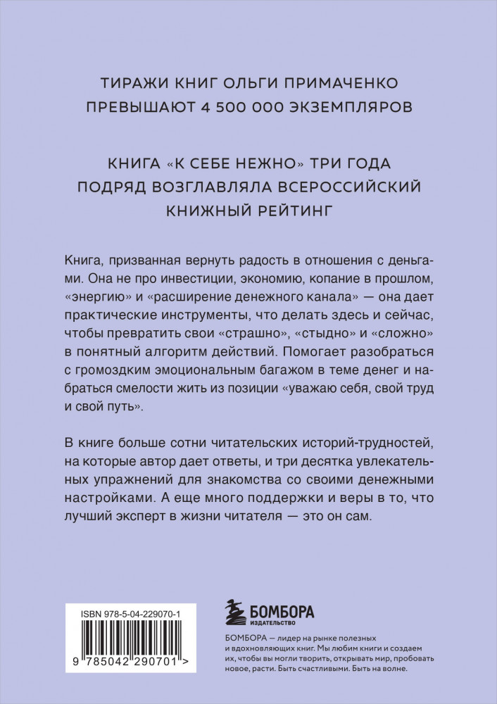 💳 Оплатить за товар можно при получении 🇰🇿 Есть бесплатная доставка по Казахстану от 1 дня 🎁 Копите бонусы с каждой покупки Серия: Книги, которые обнимают. Авторская серия Ольги Примаченко Книга, призванная вернуть радость в отношения с деньгами. Она не про инвестиции, экономию, копание в прошлом, «энергию» и «расширение денежного канала» — она дает практические инструменты, что делать здесь и сейчас, чтобы превратить свои «страшно», «стыдно» и «сложно» в понятный алгоритм действий. Помогает разобраться с громоздким эмоциональным багажом в теме денег и набраться смелости жить из позиции «уважаю себя, свой труд и свой путь». |