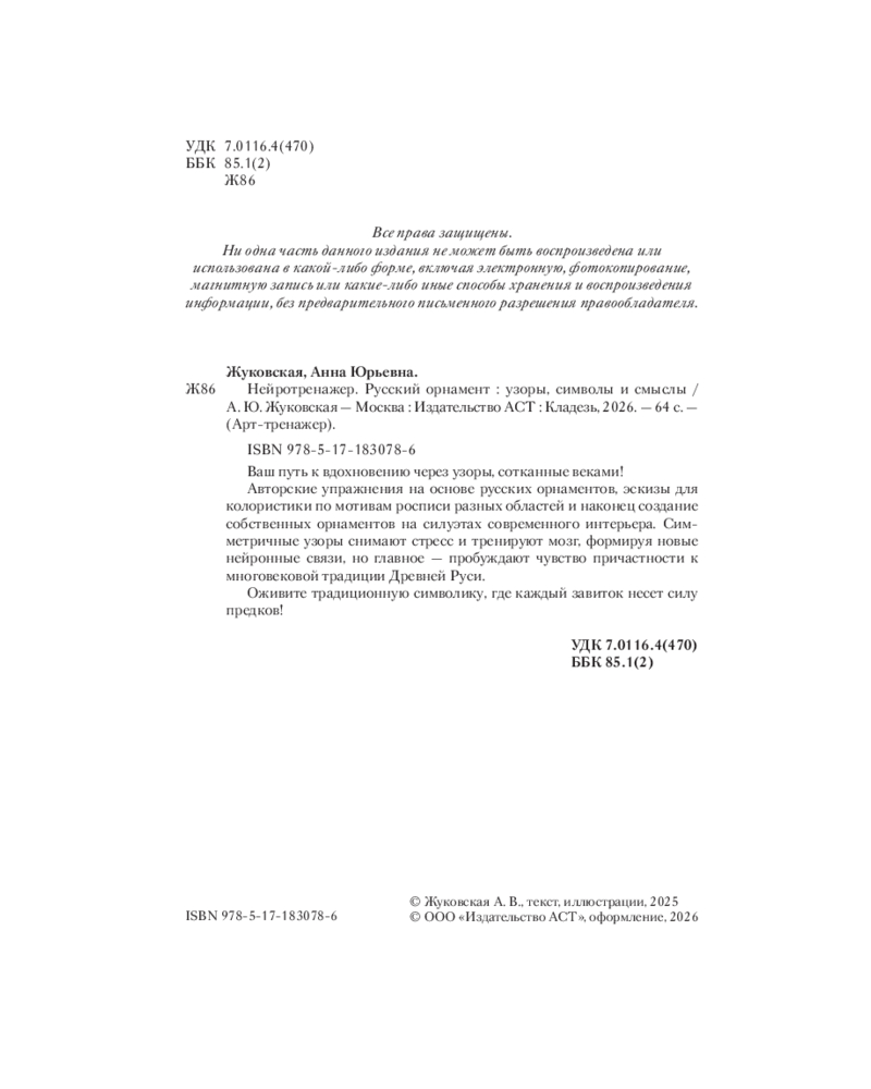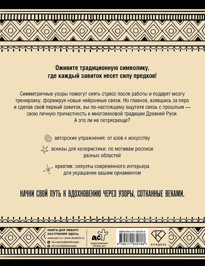 💳 Оплатить за товар можно при получении 🇰🇿 Есть бесплатная доставка по Казахстану от 1 дня 🎁 Копите бонусы с каждой покупки Серия: Арт-тренажер Ваш путь к вдохновению через узоры, сотканные веками! Авторские упражнения на основе русских орнаментов, эскизы для колористики по мотивам росписи разных областей и, наконец, создание собственных орнаментов на силуэтах современного интерьера. Симметричные узоры снимают стресс и тренируют мозг, формируя новые нейронные связи, но главное — пробуждают чувство причастности к многовековой традиции Древней Руси. Оживите традиционную символику, где каждый завиток несет силу предков! |